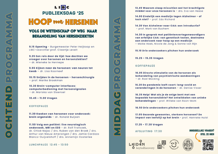 Elk jaar organiseert het LIBC in samenwerking met de gemeente Leiden een Publieksdag over hersenonderzoek. Dit jaar zal de onderzoeksgroep van het LUMC binnen het thema Neuroscience het programma verzorgen. Het zijn namelijk hoopvolle tijden: zo is er nu voor het eerst een geneesmiddel op de markt dat de ziekte Alzheimer kan vertragen. Maar dit is duur, heeft maar beperkt effect en is er niet voor iedereen, dus nog volop ruimte voor verdere ontwikkelingen! Hoe helpt de wetenschap om de hersenen en hersenziektes te begrijpen? Hoe worden opnames gemaakt van het brein? Hoe ziet een neurologisch onderzoek eruit? Hoe kunnen we begrijpen hoe een hersencel werkt? Allemaal onderwerpen die aan bod komen tijdens de publieksdag met bijvoorbeeld een live demo van een MRI scanner en EEG.