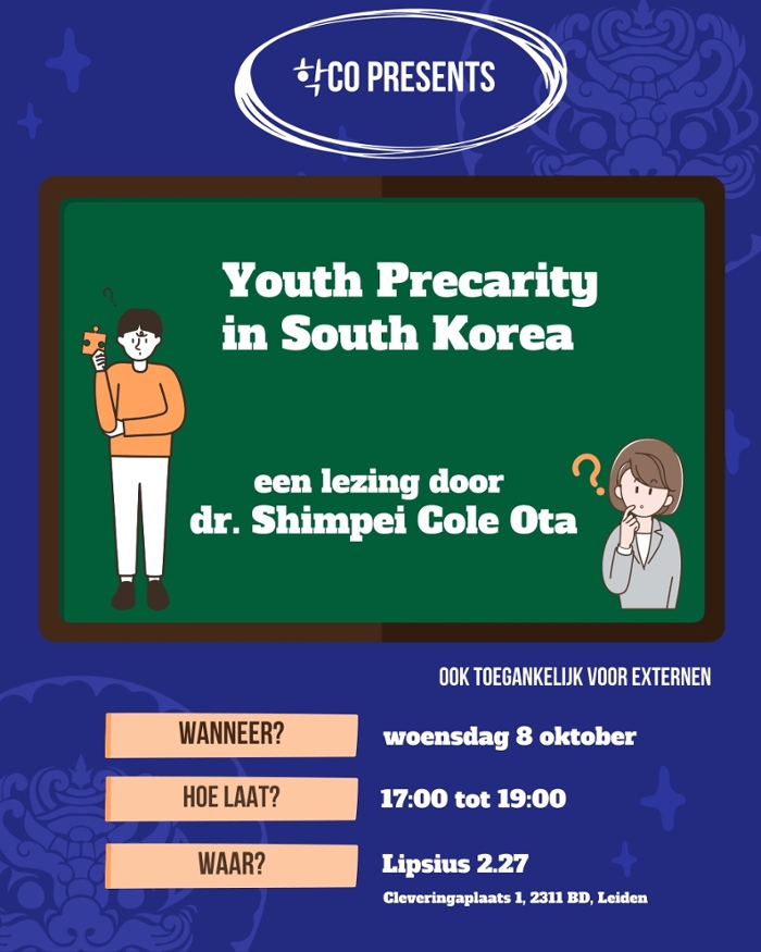 Op woensdag 8 oktober zal Dr. Shimpei Cole Ota komen vertellen over youth precarity in Zuid-Korea. In deze lezing zal het gaan over de onzekerheden waar Zuid-Koreaanse jongeren vandaag de dag mee te maken hebben, waardoor het land de bijnaam “Hell-Chosun” heeft gekregen. Door gesprekken met Zuid-Koreanen, die als gevolg van deze onzekerheden voorgoed het land hebben verlaten, zal Dr. Shimpei Cole Ota zijn bevindingen delen over wat nou precies de redenen zijn geweest voor deze mensen om hun thuisland achter te laten. Benieuwd naar wat jonge Zuid-Koreanen heeft gemotiveerd om naar het buitenland te vertrekken? Meld je dan kort aan via het aanmeldingsformulier en kom vooral naar de lezing! Laat je aan het denken zetten en geniet tegelijkertijd van de thee en koekjes die door de 학Co worden verzorgd!
