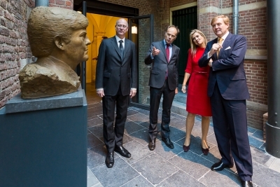 Het koningspaar bekijkt in het Academiegebouw het borstbeeld dat Aart Schonk in 2014 maakte van Koning Willem-Alexander.