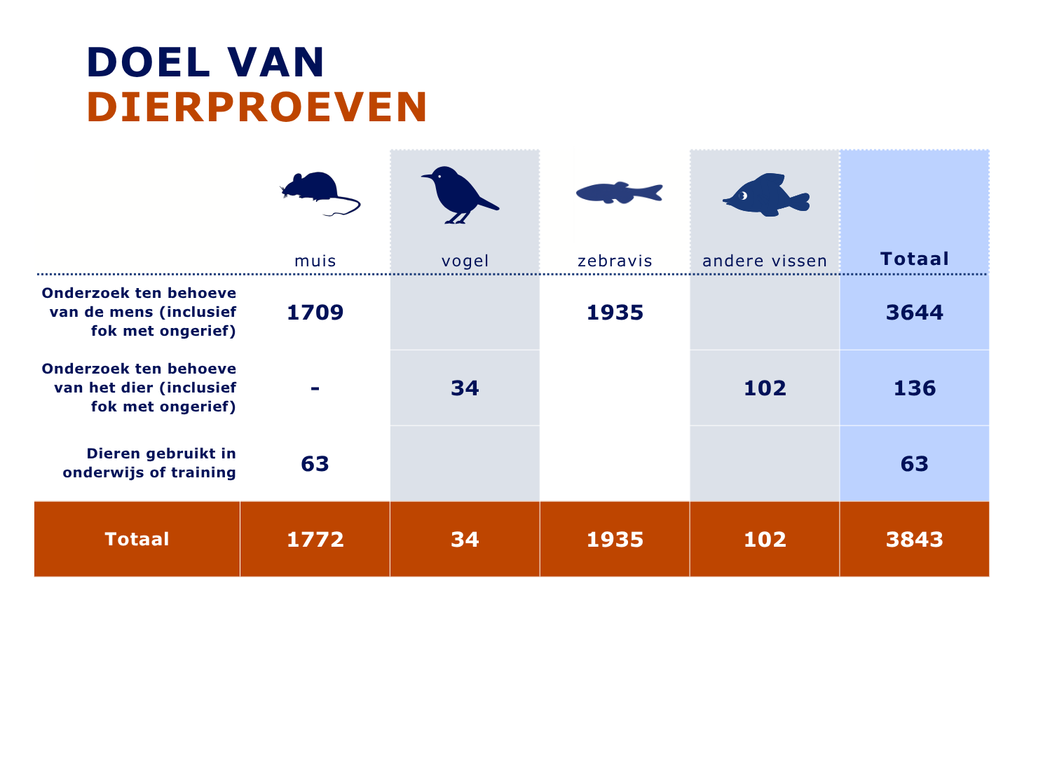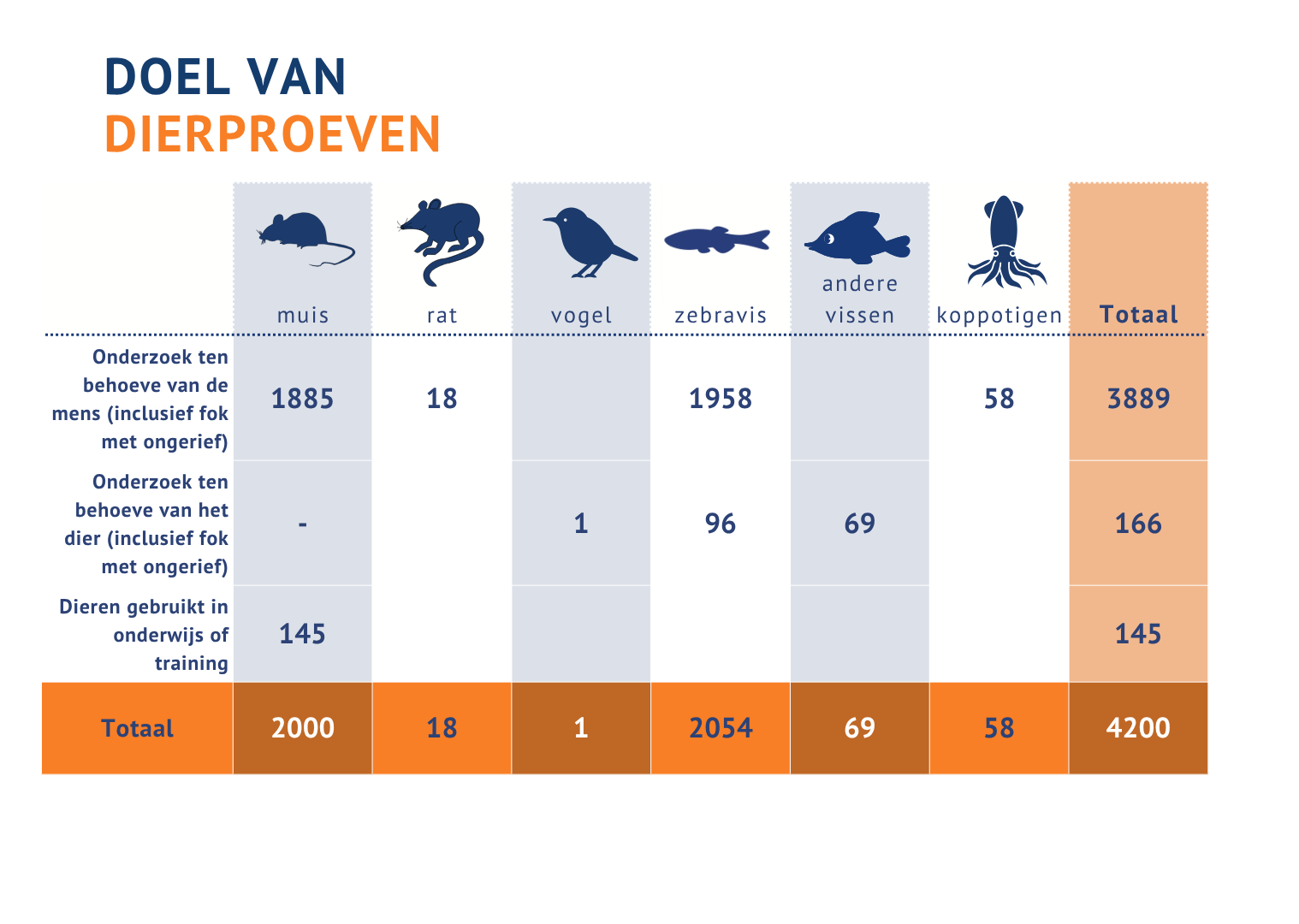 Hoeveel van elke diersoort hebben we gebruikt in dierproeven? -