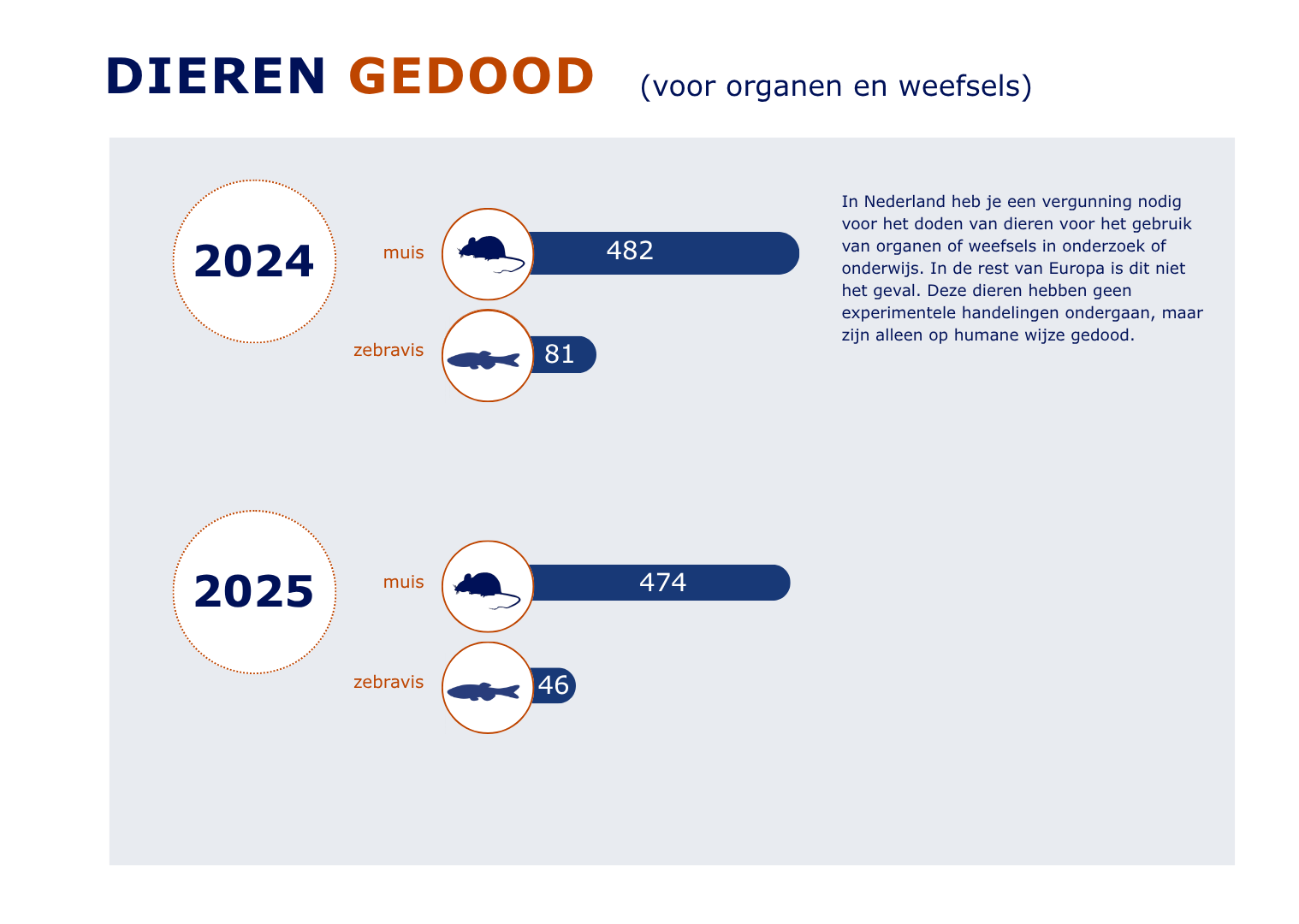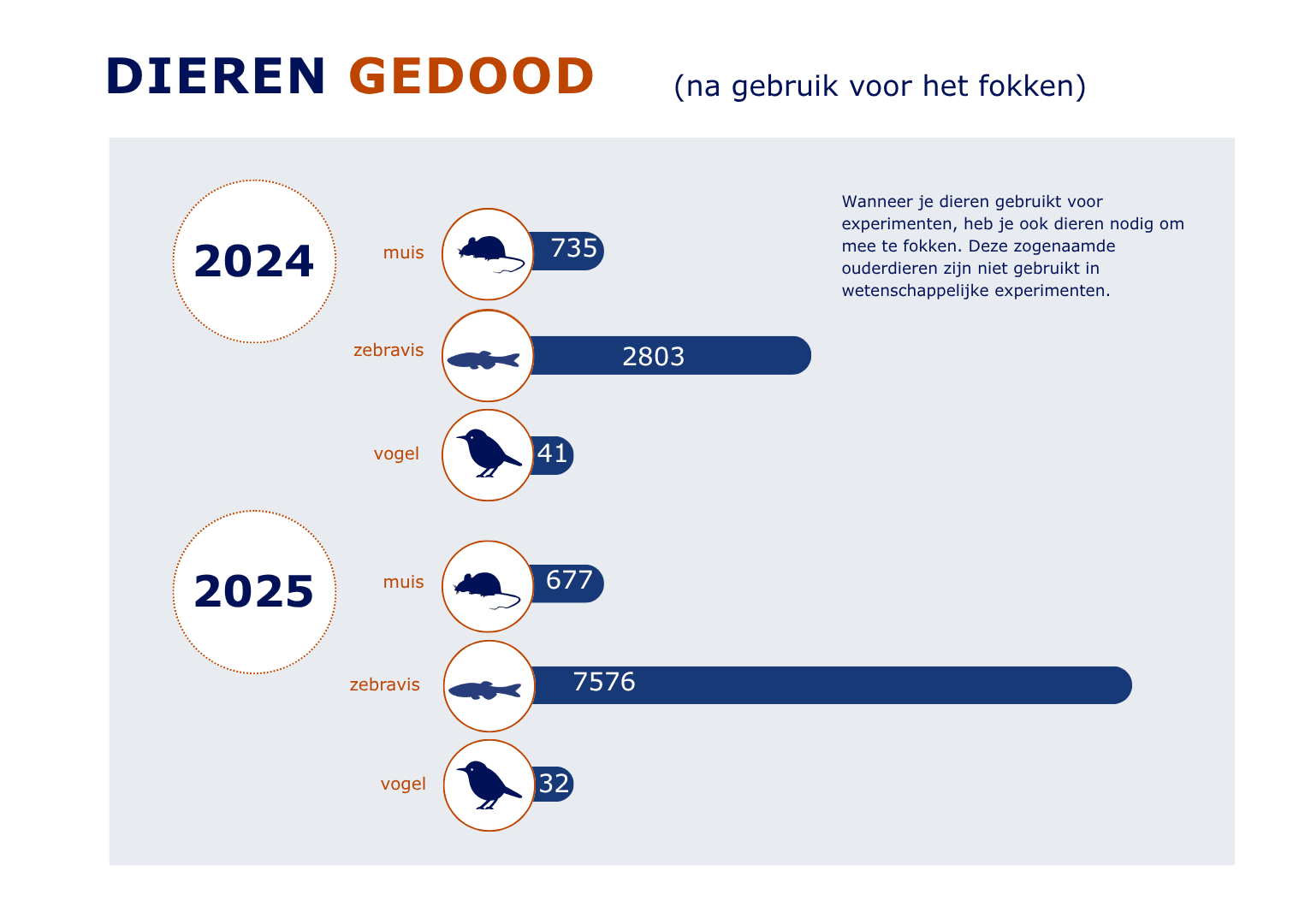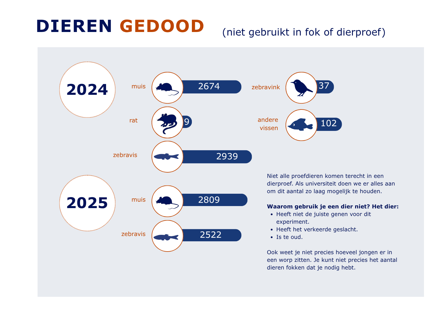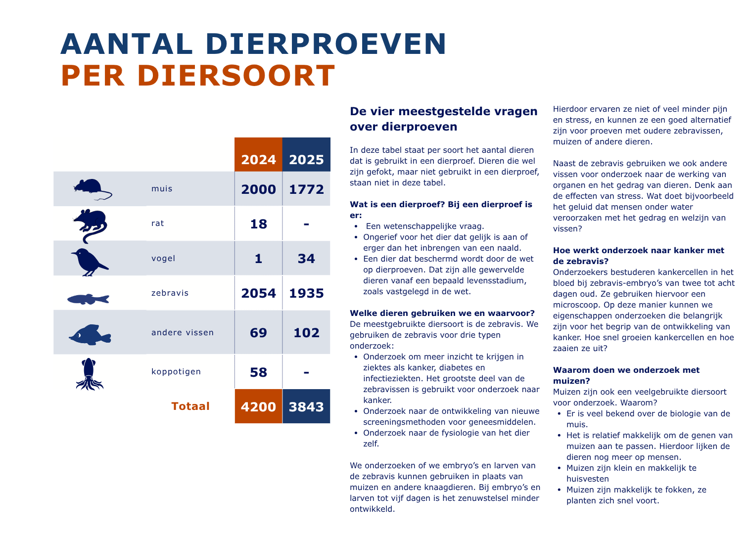 Onderstaande infographic geeft een overzicht van de uitgevoerde dierproeven in 2025, en welke soorten proefdieren hiervoor gebruikt zijn. Klik op het vergrootglas om de afbeeldingen vergroot te bekijken. De volledige infographic met de jaarcijfers over dierproeven is ook beschikbaar als pdf.