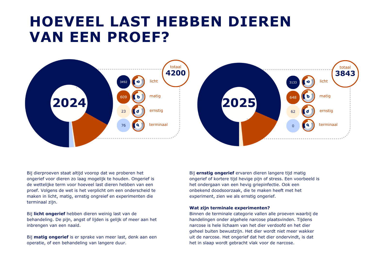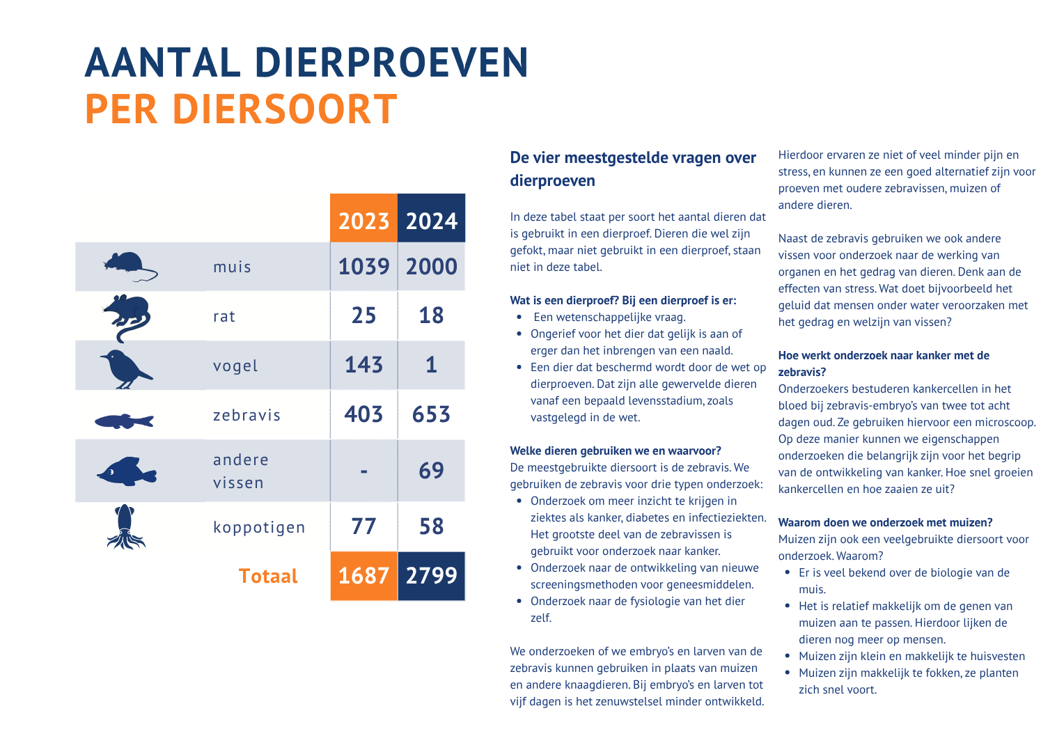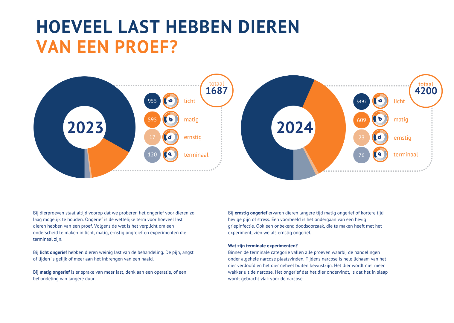 We zijn transparant over het onderzoek met proefdieren en daar hoort bij dat we onze jaarcijfers laten zien. Op deze pagina vind je een overzicht van allerlei zaken, zoals het aantal dieren en de diersoorten die we gebruiken, type onderzoek waarvoor we de dieren gebruiken en de mate van ongerief dat de dieren ervaren hebben.