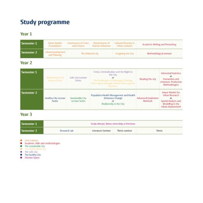 In year two you will deepen your knowledge by following lectures in the programme’s four themes: the sustainable city, the multicultural city, the safe city and the healthy city. Courses on all themes include individual and group assignments, where you gain hands-on experience of the issues involved. You will choose two out of the four themes to specialise in in your second year, you will take elective courses to deepen your understanding of these themes.