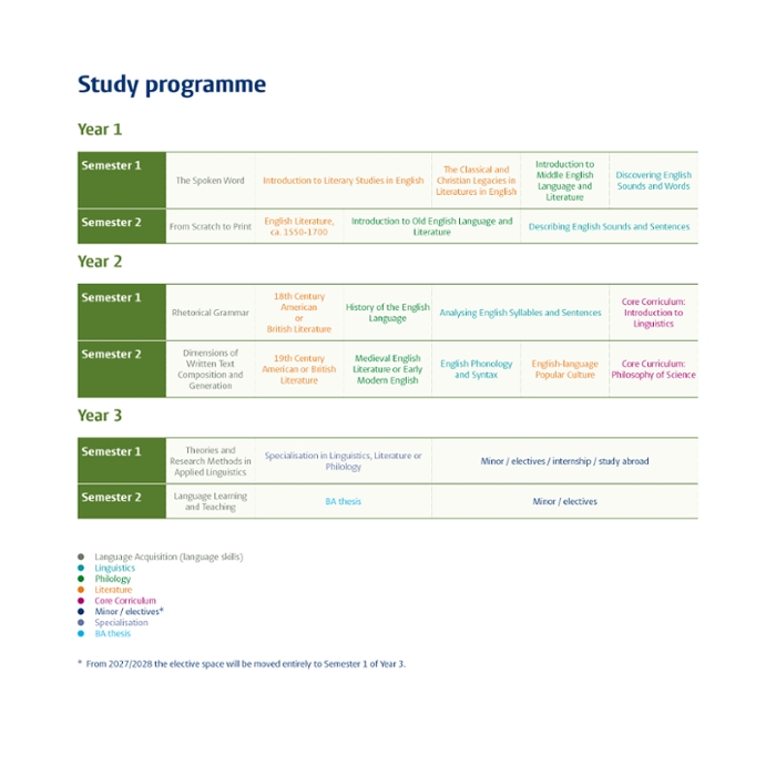 Your existing English language skills will be substantially developed, both in terms of your spoken and written English proficiency. In the area of linguistics, you will delve deeper into language as a system. In the literature classes, you will become familiar with the rich world of English literature, while in the philology courses you will study Old English and Middle English literature and the earliest stages of the English language.