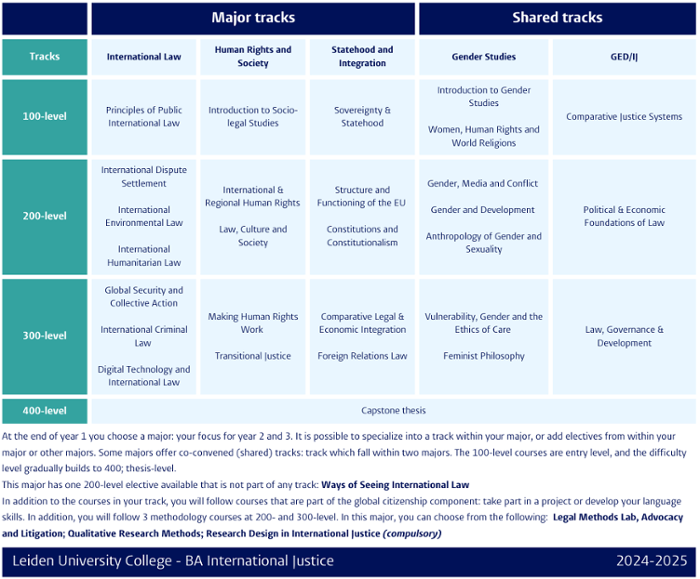 The International Justice (IJ) Major at Leiden University College The Hague It explores challenges to justice and the rule of law in a globalizing and pluralistic society. These include the realization of human rights, climate justice, ending impunity for war crimes and economic and political integration. While international law and institutions serve as the starting point for many key issues, the International Justice Major focusses also on national and regional legal orders as well as relevant transnational and local norms and actors. Moreover, the Major analyzes how norms, laws and institutions operate in practice through comparative and interdisciplinary approaches that combine legal research with socio-legal and other approaches from the social sciences.