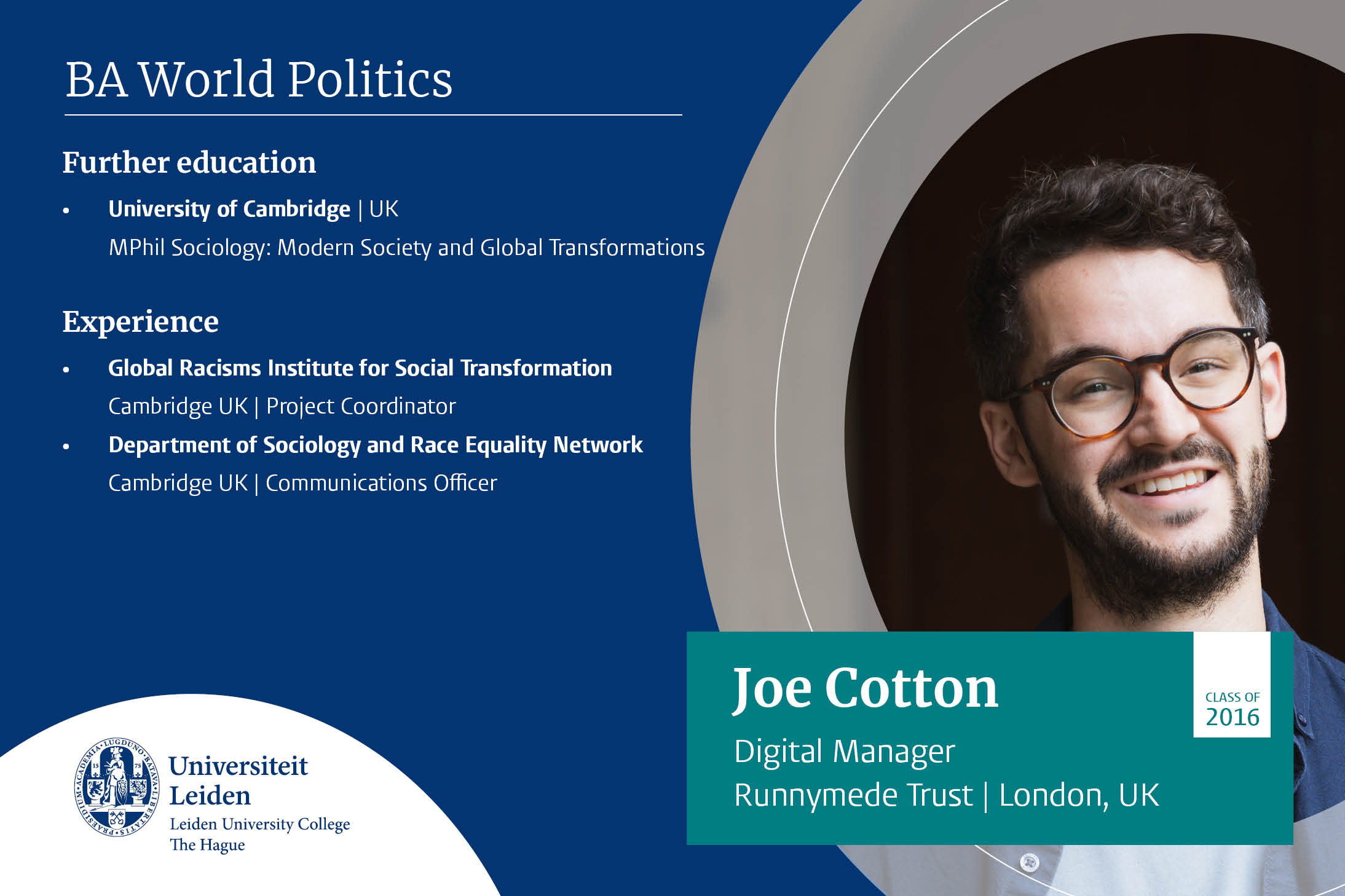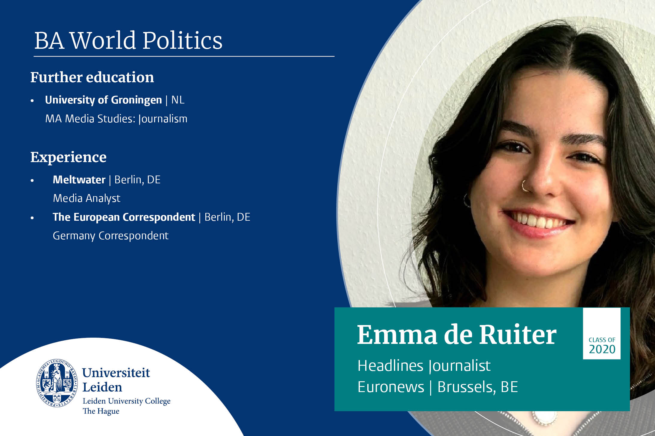 ''I chose World Politics because I realised that by understanding the political, I would also be able to make better sense of other fields such as the economic, social, cultural and environmental. The excellent balance between theory and practice deepened my understanding of the intricate processes and debates that shape the contemporary world. It taught me how to tackle pressing issues with an interdisciplinary approach and from diverse perspectives; today, I can make use of these skills in my work as a diplomat at the Dutch Ministry of Foreign Affairs.’’