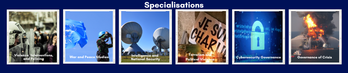Six specialisations are available, each with their own thematic focus, and each with further scope for customisation. You will be able to specialise in areas of Terrorism, Political Violence Crisis Governance, Violence, War & Peace, Intelligence and Cyber.