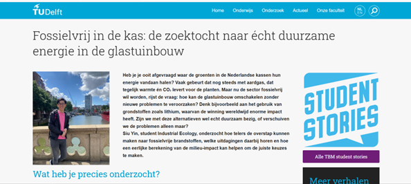''While orienting myself for a master's programme, I found myself worrying a lot about one of the most urgent challenges of our time: climate change. As I was pursuing my bachelor’s degree in Technology, Policy & Management, I became increasingly interested in our environment, the energy transition, and sustainable development. I knew that I wanted to learn more about this. In my bachelor’s studies, I learned to combine multiple disciplines and come up with solutions that are not only technically, but also socially and politically feasible. This interdisciplinary approach was also what drew me to the master’s in Industrial Ecology (IE), which adds an important focus on the environment. It felt like a logical next step.