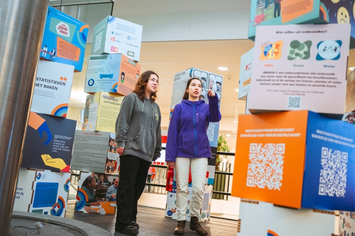 Therefore, from 20 February onwards, the exhibition Presenting with the City is on display in the hall of the faculty and everyone can see for themselves which projects have been carried out. Via QR codes on the different cubes, you can watch videos of the projects, or other ways that make results visible.