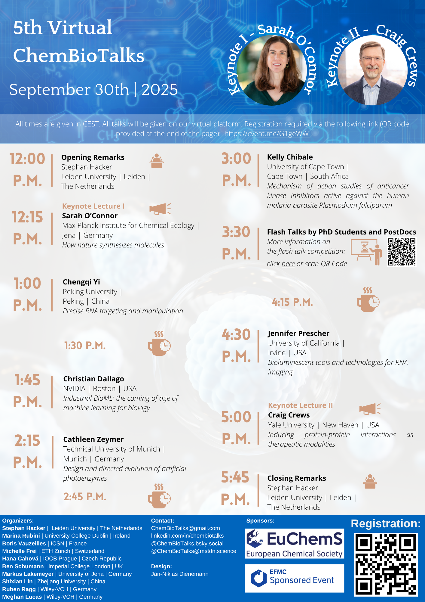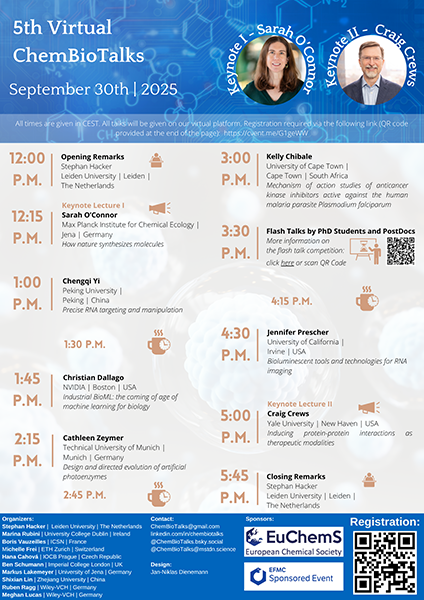 This year’s Virtual ChemBioTalks will take place on September 30th, 2025, from 12 p.m. to 6 p.m. CEST. We are very happy to have Sarah O’Connor (Max-Planck Institute for Chemical Ecology, Jena) and Craig Crews (Yale University) as our keynote lecturers. Furthermore, we will have exciting talks by Kelly Chibale (University of Cape Town), Cathleen Zeymer (Technical University of Munich), Chris Dallago (Nvidia Corporation), Jennifer Prescher (University of California, Irvine) and Chengqi Yi (Peking University).