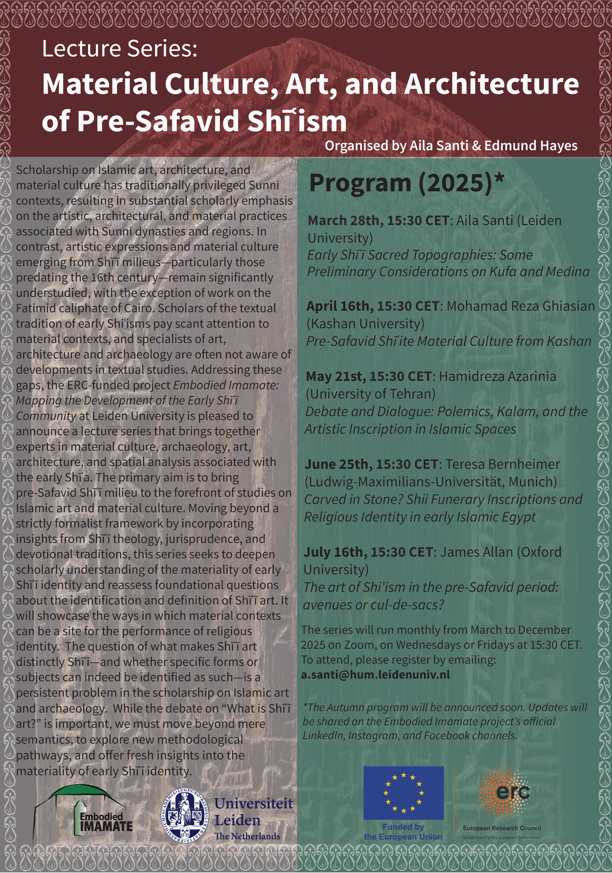 In the lecture series " Material Culture, Art, and Architecture of Pre-Safavid Shīʿism.” We host online talks in order to foster greater engagement between scholars of early Shīʿism who focus on texts and specialists in Islamic material culture, art, architecture, and archaeology. You can find past lectures on our youtube channel.