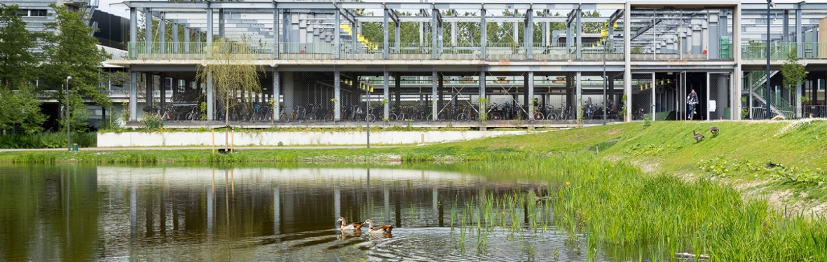 The lower stories of the old Gorlaeus high-rise were saved from demolition. They are turned into a new, green bicycle storage to accommodate more than 3.000 bikes. The bike storage is located on the ground floor. On the first floor, a pleasant rooftop garden has been created. Part of the old steel construction has turned into a plant-clad pergola.