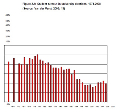 In 1971, the first year, 43 per cent of students voted and the turnout then increased a little every year until it reached a peak of more than 50 per cent in 1982. After that the turnout dropped dramatically. By 1996, it had dropped to 34 per cent and in the following year, when the powers of the Council were reduced, it dropped even further, to 24 per cent. In the last few years the turnout has been hovering around 20 per cent.