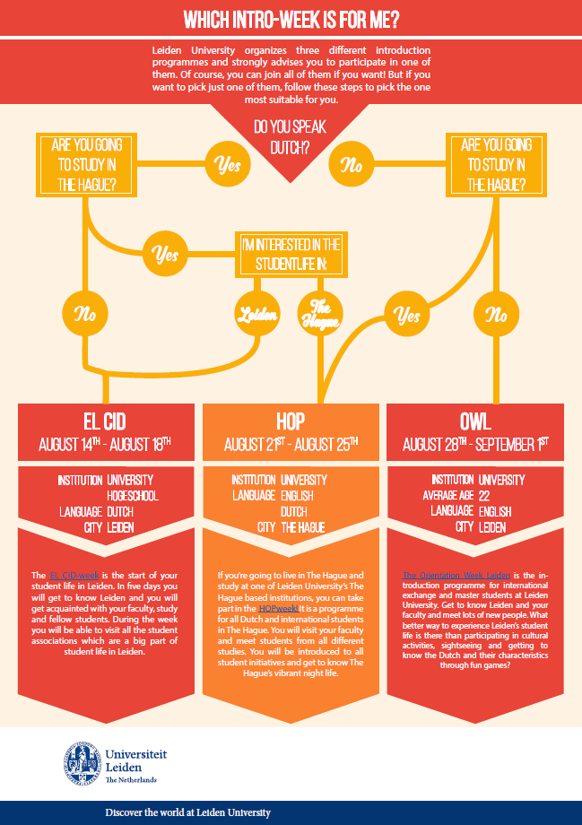 Leiden or The Hague? Dutch or English? These two questions decide which introduction week new students at Leiden University can best choose: EL CID, HOP or OWL.