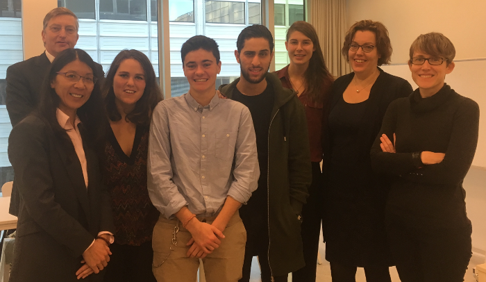 From left to right: Prof. Dr. Pancras Hogendoorn (Dean of LUMC), Dr. Joanne Liu (International President of MSF), Daphne Gamberiakis, Emma Basetti, Ilyaas Sherally and Madelaine Alber (all LUC students), Lieke Schreel (Educational Director LUC), and Dr. Ann Wilson (Assistant-Professor of History and Gender Studies at LUC)