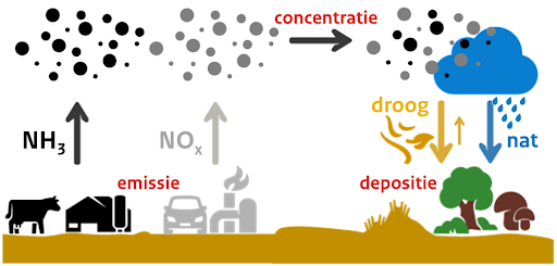 Nitrogen (N) is the most important nutrient for plants and essential for food production. Farmers therefore use it as fertiliser. Part of the nitrogen ends up in the air in the form of ammonia (NH3). Other sectors, such as traffic and industry, also emit nitrogen oxides (NOx).