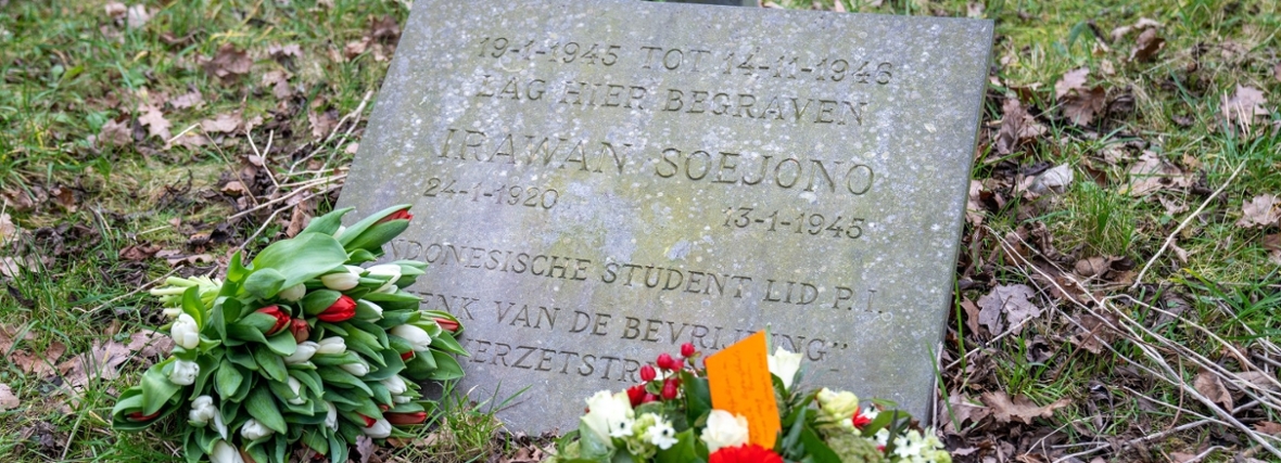 To mark its 75th anniversary, the Netherlands War Graves Foundation is publishing a portrait of a war victim every week this year. On 24 January the drawing of Irawan Soejono, a Leiden student and Indonesian resistance member, was unveiled at the Groenesteeg cemetery in Leiden, the place where Soejono was briefly buried after his death.