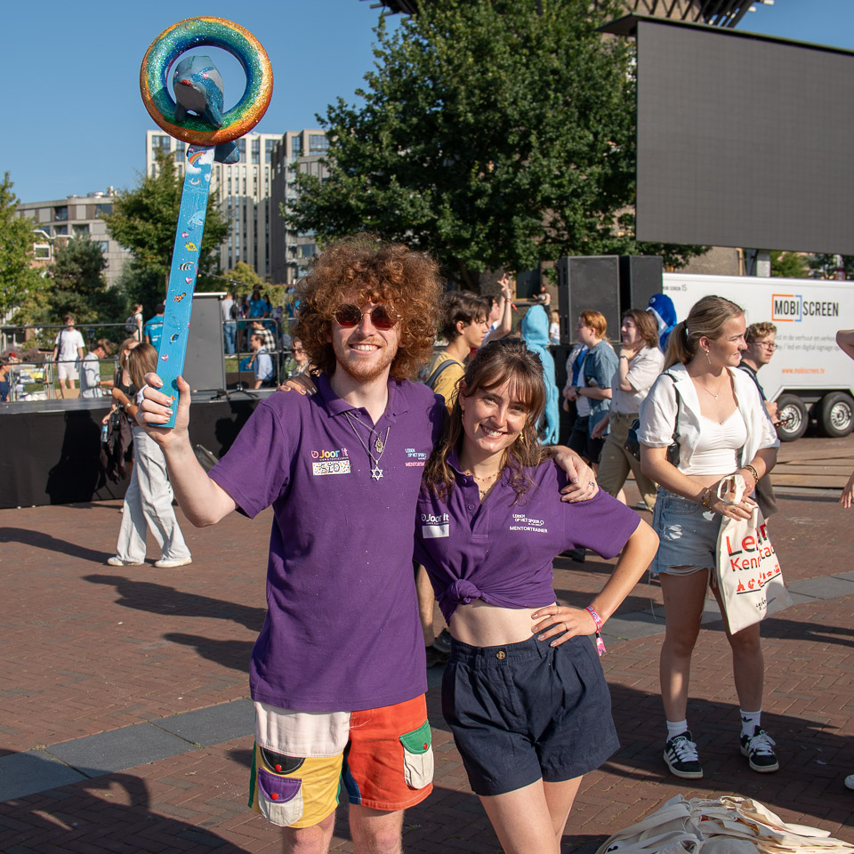 Experienced mentors Sid and Olivia, who also trained new mentors this year, want their group to see as much of Leiden as possible. ‘The main aim is for everyone to have found their way by the end of the week – whether that’s in an association, on their degree programme or somewhere else in town’, says Sid. With a heatwave forecast, they are also helping students keep cool with plenty of ice lollies, shade and sunscreen. Olivia and Sid’s sign is hard to ignore. ‘Our theme had to be glitter. We saw this dolphin and thought it was the perfect combo. Hopefully he’ll stick with us all week’, Sid jokes.