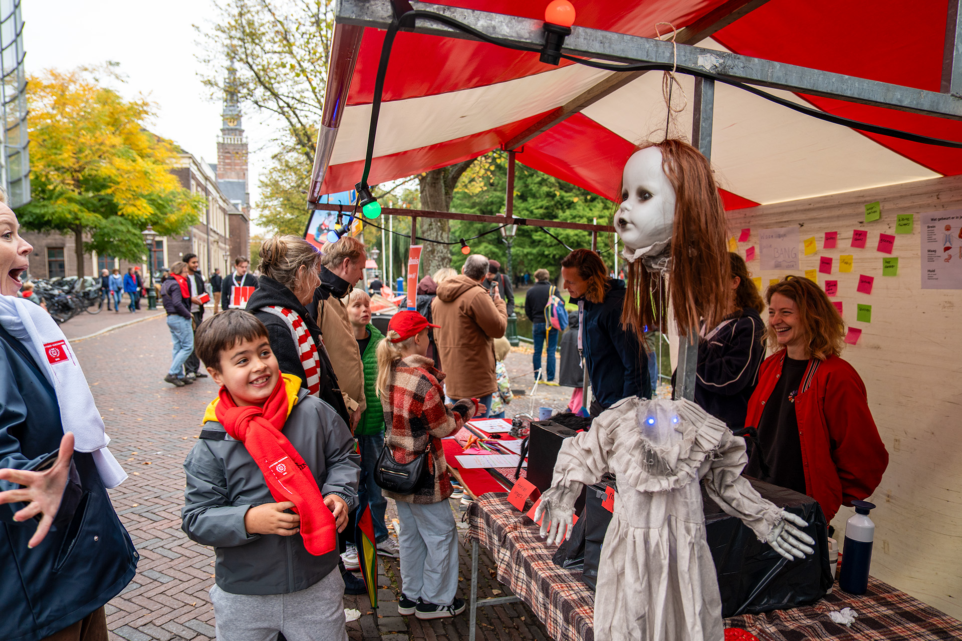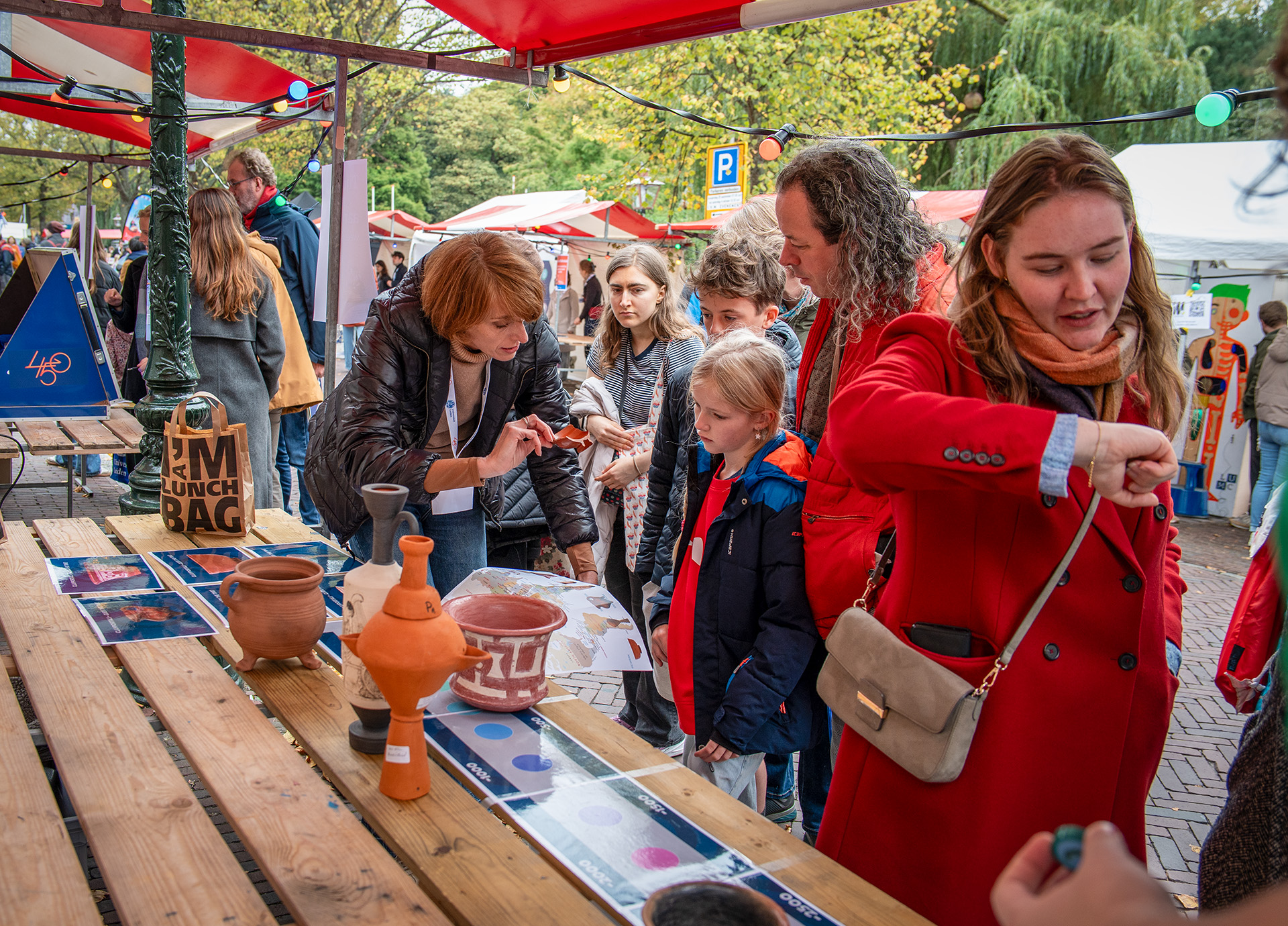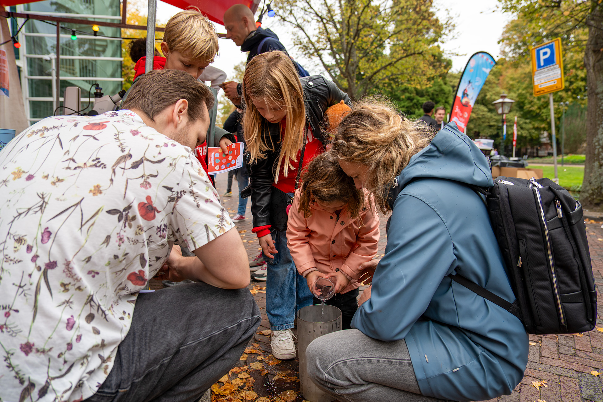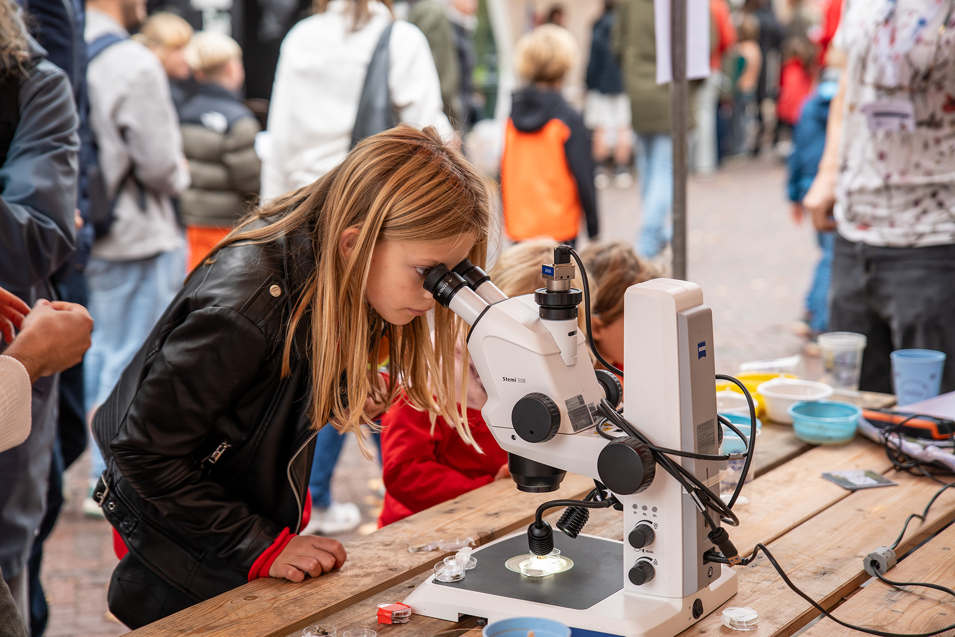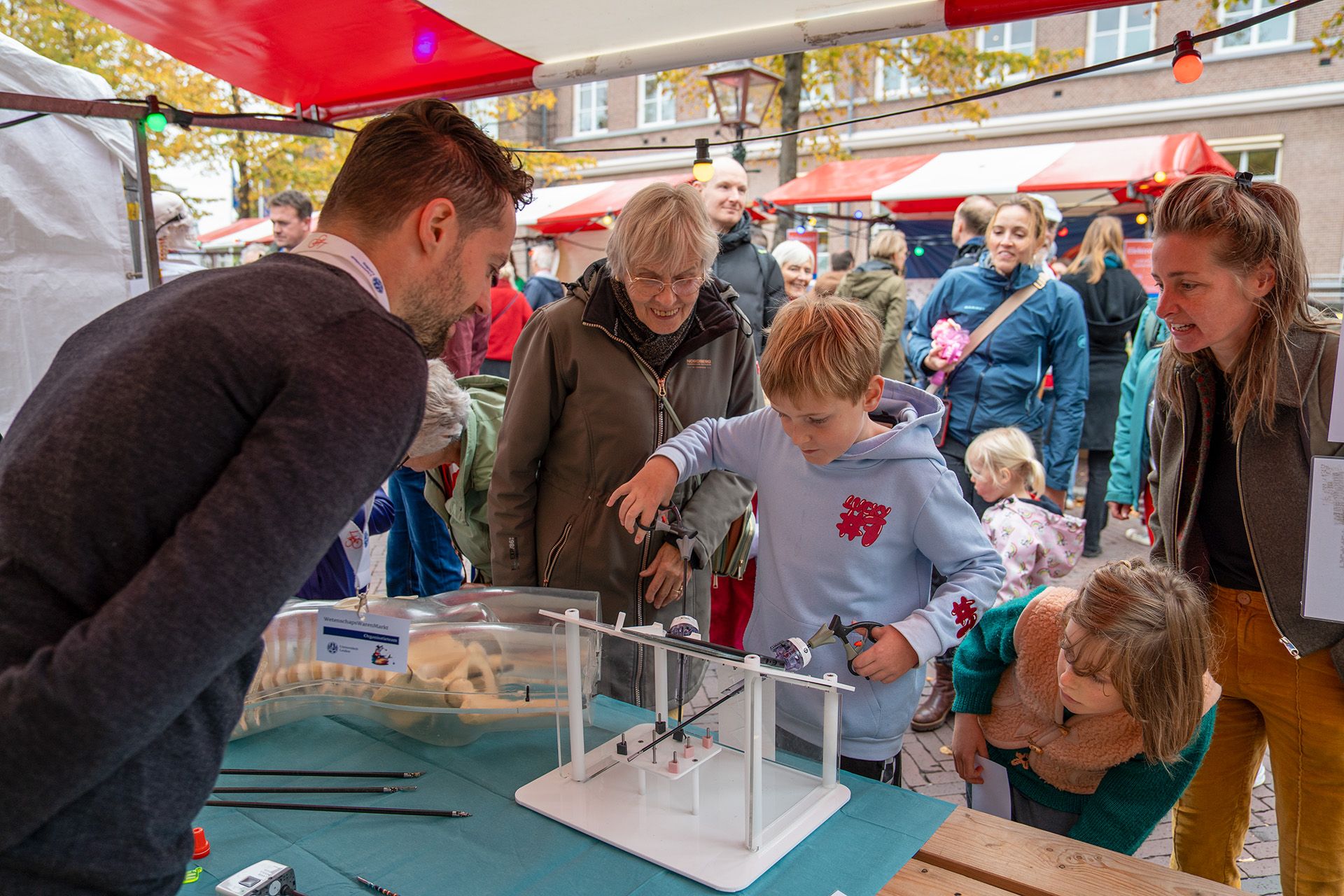 Armed with stamp cards, hundreds of visitors stroll past the science-packed 14 market stalls on Steenschuur, offering the chance to peer through a microscope, hear fun facts about cybersecurity and molecules, travel through time with pottery and much more.