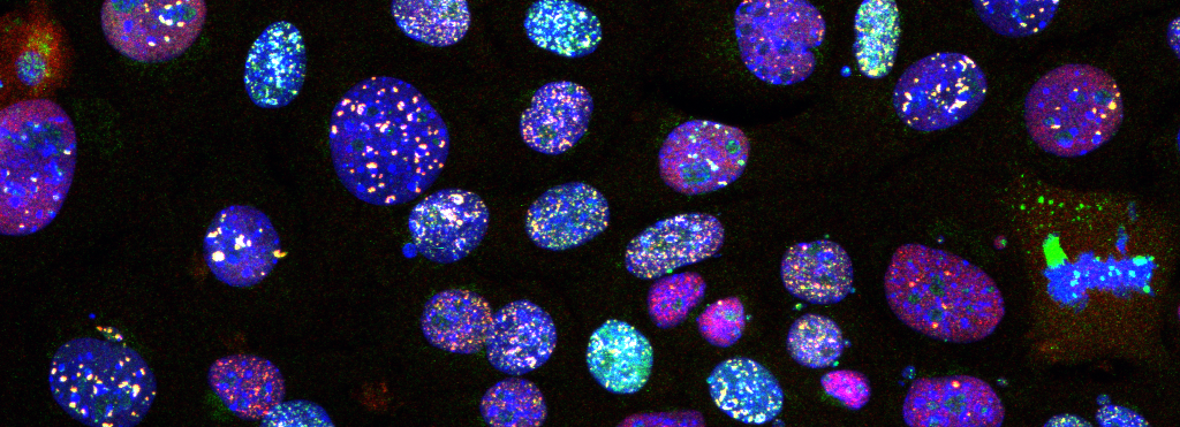 About the header image: This image shows cells from a mouse with breast cancer. Each bright dot marks a site of DNA damage being repaired. Using special antibodies that recognise repair proteins, scientists can watch how cells find and fix broken DNA.