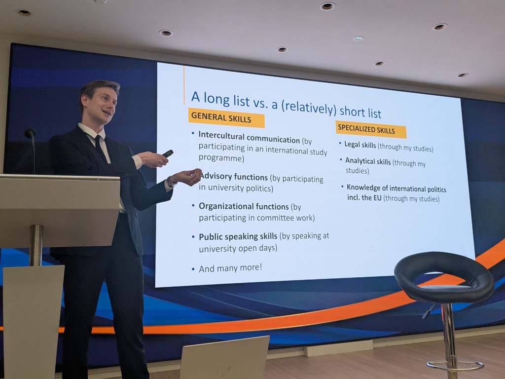 The alumni emphasized several important tips. Many speakers noted that, in the end, it doesn’t really matter what you studied and that career paths don’t always need to follow a straight line. An atypical study or career trajectory can even be an advantage. What matters most are the skills you develop during your studies. As Casper de Boer said: 'It is okay to be a generalist' and 'Be a Swiss army knife.' By this he meant that being versatile can truly set you apart in the professional field. He also stressed the importance of thinking carefully about how you present your CV, since you decide how you portray yourself and how you connect the experiences listed on your CV. Finally, most alumni emphasized that within the EU, everything revolves around networking: the people you know can help you with finding an internship or a job, and you can help them.