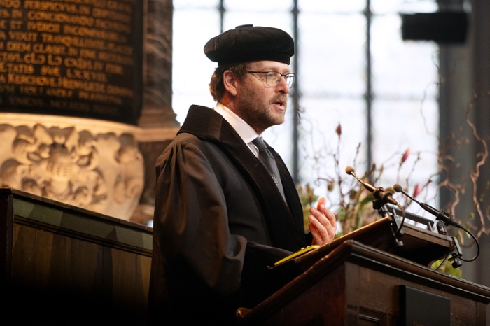 The new Rector Magnificus, Sarah de Rijcke, and the new President of the Executive Board, Luc Sels, led the cortège for the first time from the Academy Building to the Pieterskerk. After the professors had taken their seats, Sels opened the Dies Natalis with stirring words.