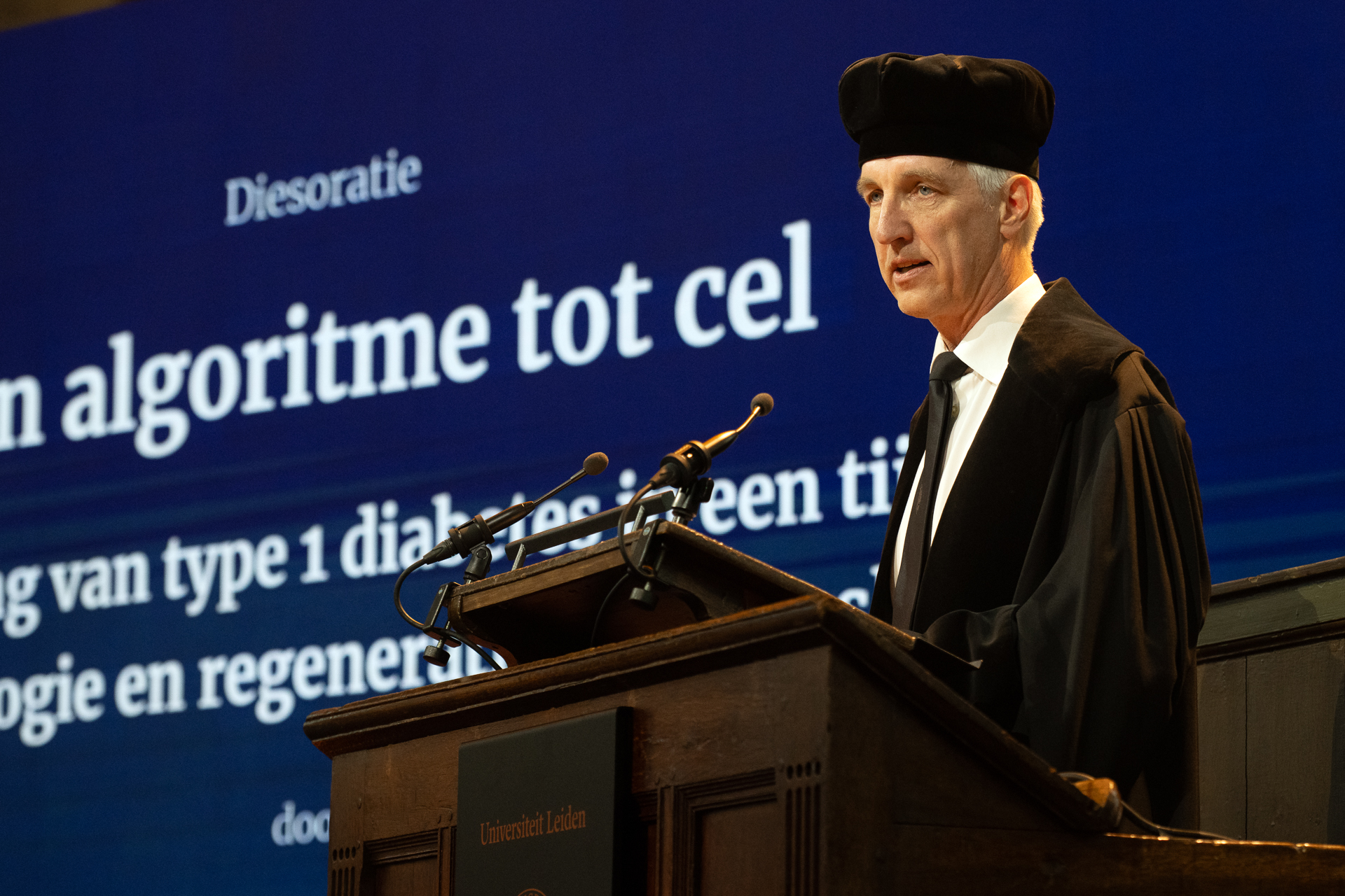 ‘Doctor, do you think I’ll ever see a cure for type 1 diabetes?’ That’s a question Dies Natalis orator Eelco de Koning, Professor of Diabetology at the Leiden University Medical Center, is regularly asked. There are many possible routes to a cure, and each brings further questions, he explained. His own work focuses on using regenerative medicine to cure the disease. In the lab, his research group grows insulin-producing cells from stem cells within a month, and can introduce genetic modifications to these cells. ‘This opens the door to treatments that don’t require immunosuppressants. And that means: hope. Not just for a small group but ultimately for everyone with type 1 diabetes.‘