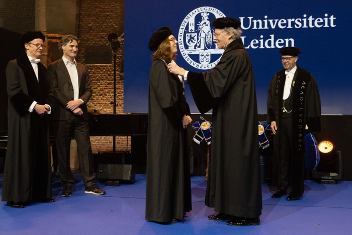 A special moment during the ceremony was the transfer of the rectorship to Professor Sarah de Rijcke. In front of the academic community, De Rijcke received the chain of office before delivering her inaugural Dies Natalis address. She reflected on the societal and geopolitical unrest that is affecting the daily lives of students and staff. ‘Sometimes their engagement takes the form of protest; that is part and parcel of a vibrant democracy. What matters is that we continue to question each other’s arguments from a position of knowledge and care.’