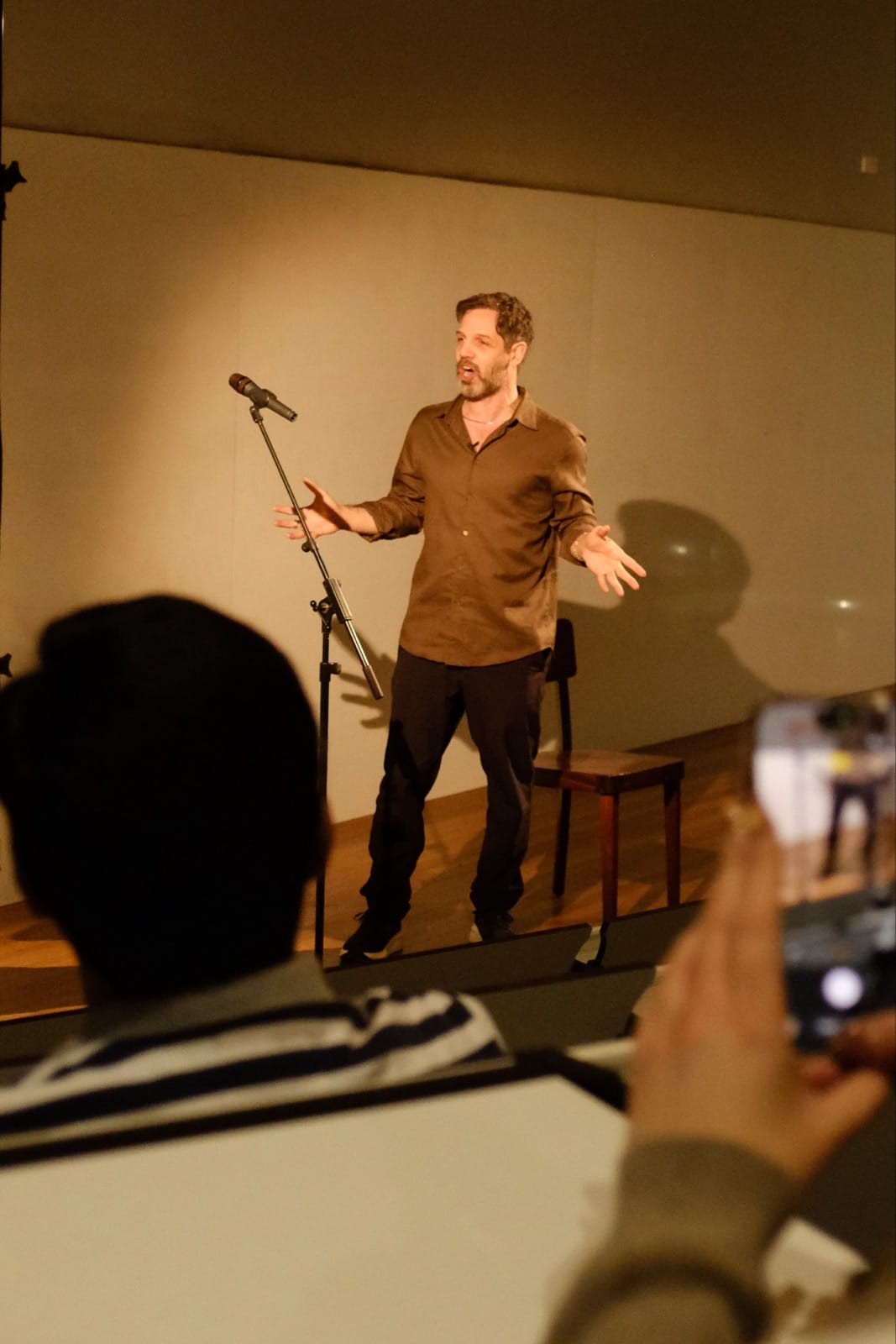 In a packed lecture hall at the Lipsius building, Palestinian-Israeli actor Yousef Sweid performed excerpts from his solo play, a personal piece exploring identity, belonging, and life between languages, cultures, and conflicting historical narratives. The performance is rooted in Sweid’s experience growing up in Haifa and later moving to Berlin. It combined humour and reflection to narrate a life lived on the faultline of the Israeli-Palestinian conflict.