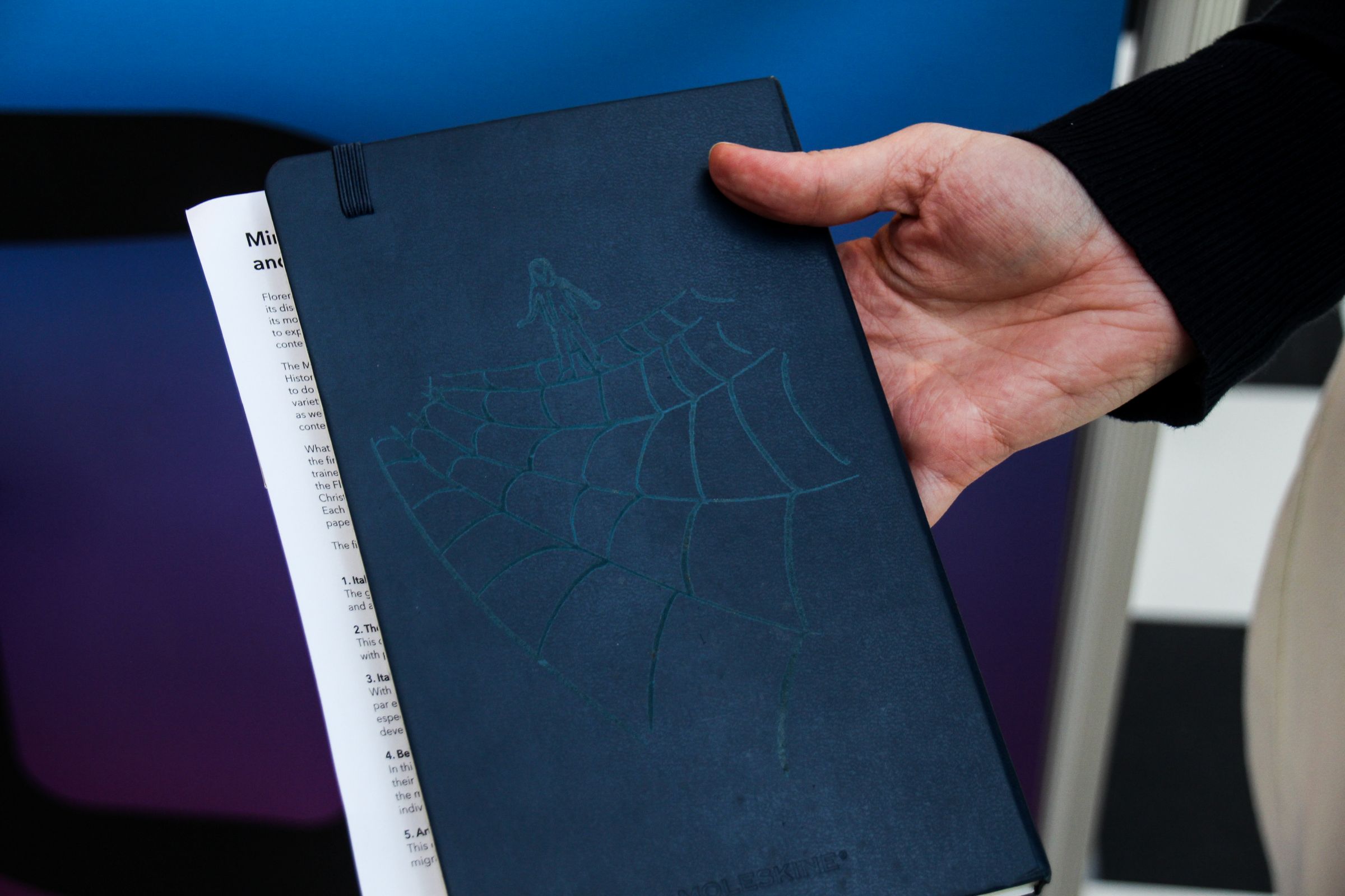 Shortly afterwards, assessor Mette Kamerich picked up an engraved notebook from the engraving table. ‘When I sat down, I thought it would be a sort of interview, but it was an incredibly relaxed conversation,’ she said. ‘We agreed that, as an assessor, I try to sense what is needed in every situation. The artist then beautifully depicted that in an image of a human figure and a web.’