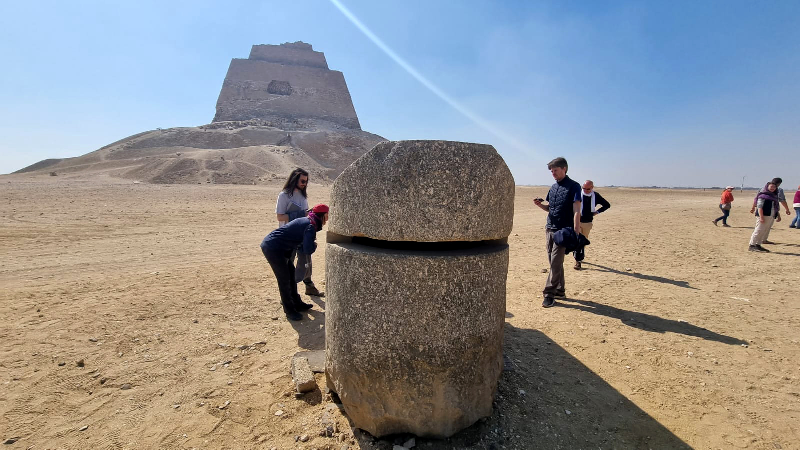 Peter rendezvoused with Sergio – whose NVIC lecture we enjoyed last week – and let us loose in the Teti cemetery, where we roamed around Mereruka’s tomb. In the maze of chambers, we admired all sorts of scenes from dancers to disobedient tax-payers, hippopotami to hyenas. We made brief pit stops in Teti’s pyramid and the tomb of the vizier Kagemni. Yagmur’s presentation at the Serapeum was next. She led us through the newly-restored catacombs and remarked on some of the 24 colossal sarcophagi for Apis bulls produced from the 26th Dynasty onward. After reuniting with Peter and Sergio we visited the tombs of Nemtymes (a Ramesside official) and Maya (Tutankhamun’s wetnurse) and finally also the Imhotep Museum, where we saw humongous alabaster vessels and some of Djoser’s faience tiles.