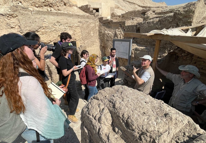 Afterwards, we headed over to Deir el-Bahari, where Marleen and Andrés gave us an overview of the site as well as some specificities about the surrounding rock-cut tombs. We then headed up the temple of Hathsepsut and marvelled over the painted reliefs like the voyage to Punt and the divine birth of Hathsepsut. We also used this moment to practice our hieroglyph deciphering skills with the inscriptions on the walls relying on each other to correct or add to our translations – it was a great teamwork exercise. The day wasn’t over yet. We visited Carter’s excavation house and gained insight into what it was like to be an Egyptologist during the early 20th century, also exploring the replica tomb of Tutankhamun. Exhausted but unmistakably happy, we returned to the hotel where some of us enjoyed the pool while others rested before heading out to town for a delicious dinner, ending the day full and content.