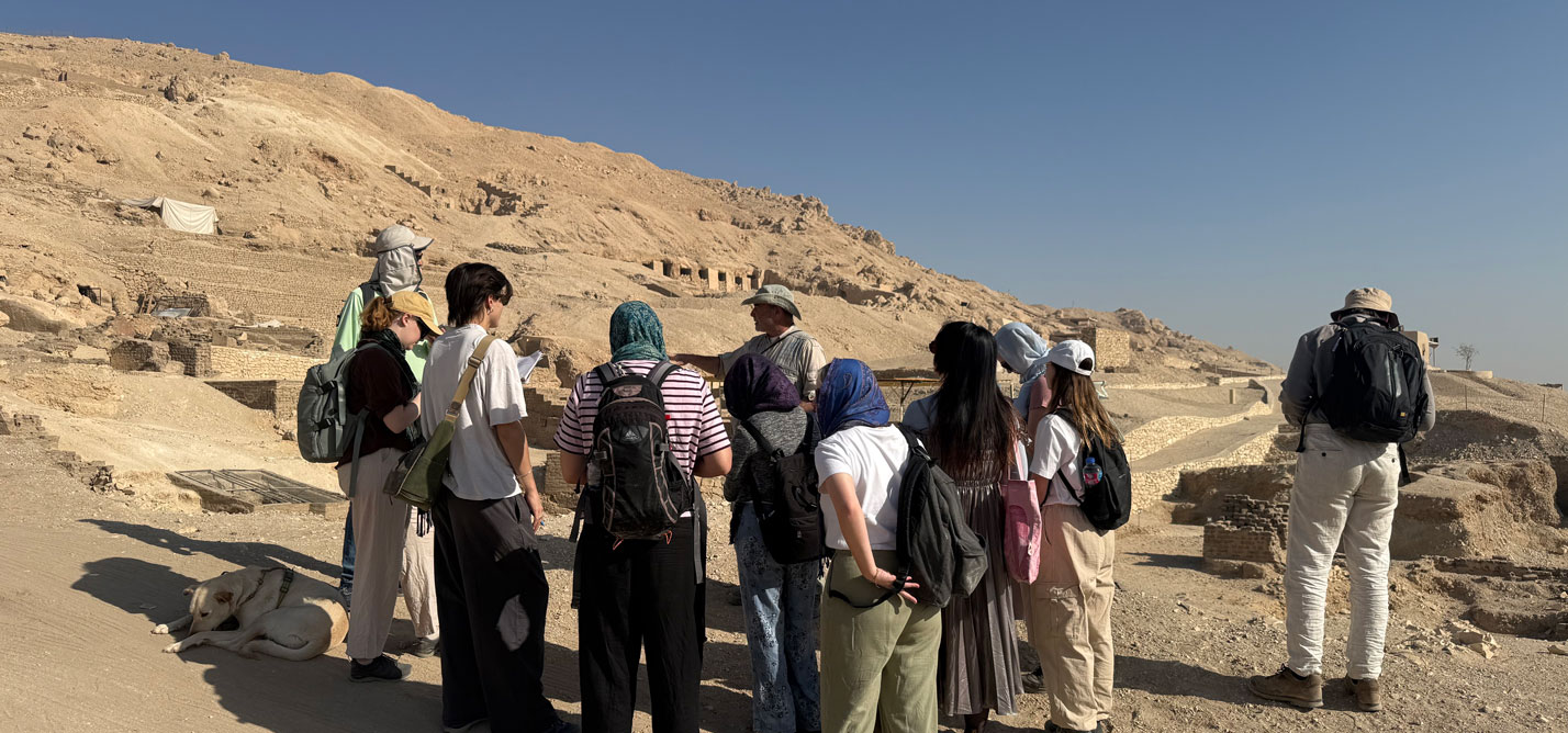 The following day, we went to visit Dra Abu el-Naga North. Lead excavator Dr. José Galan gave us a tour of the site. Another site, another pet, and today José’s dog Tutu got our attention. He is truly living his best life on the site. The mission at the moment is looking for information on the orientation of the shafts. José showed us their famous funerary garden, with the replica on top and Tombs TT12, TT11, and TT148. A remarkable part about TT12 is the focus on women in the tomb and the lack of male representation. In TT11, it was clear that the owner, Djehuty, fell into disfavor during his life, which is perhaps not hard to imagine given his big ego, as can be seen in the banquet scene where he only depicted himself.