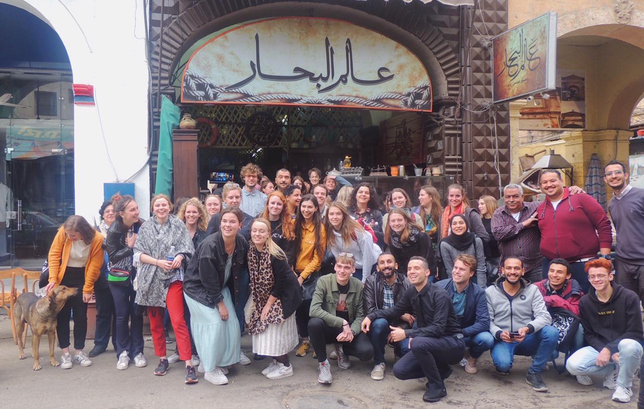 Last week we went with our students to Ismailiyya and Port Said. On Friday morning, Ahmed our driver, drove us to Ismailiyya, passing lots of fields filled with orange or mango trees, for which this part of Egypt is famous. We checked in at our hotel and caught a first glimpse of the ships navigating themselves through the Suez Canal. After acclimatizing to the fresh air and the sunny weather we entered the bus again and drove to the center of Ismailiyya to go for a walk through the European part of the city with our tour guide Asmaa'. In this part, all the high ranked officers and engineers lived with their families. There used to be a sharp line between the European part and the Arabic part of the city, but nowadays the borders are blurry and the community is mixed. After the interesting tour through the city, we went to the Suez Canal History Museum where all kinds of artifacts from the excavation of the Canal between 1859 and 1869 were gathered. After our visit to the museum, we went for lunch at Eltayben, a very nice fish restaurant. Due to some delay in the programme we were very hungry so we all attacked the delicious fish soup, shrimps, calamari, and other fish and salads like hungry lions. After dinner, we spent some time on the beach, which was very relaxing after a long day, to process all the new impressions and information we received. Some of our students took a swim or rented a pedal boat to have some fun on the water. After the beach, we went to a simsimiyya party. The simsimiyya is a typical instrument for this region of Egypt. Its predecessor is called the tamboura and was already played in Egypt in pharaonic times. We all had a lot of fun clapping and dancing to the music that the (old) men were making. The musicians were not planning on stopping the festive music so around 9:30 pm we told the musicians we had to go to dinner and we all left to have a quick bite in a restaurant not so far from our party. We were all very pleased when we got to go to our comfortable beds when we were back at our hotel.