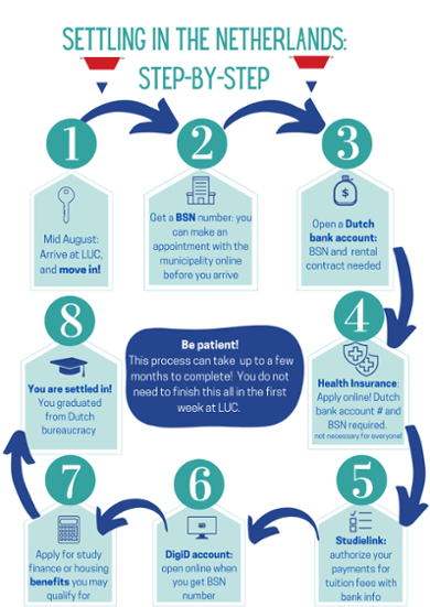 The image below gives a quick overview of the steps you will have to take in the next few months. You will be able to find most information regarding these steps on this site. It usually will take about 2 - 3 months after you have moved in to get all the bits and pieces sorted out. But don't worry! You will have lots of help from mentors, staff and Residential Assistants.