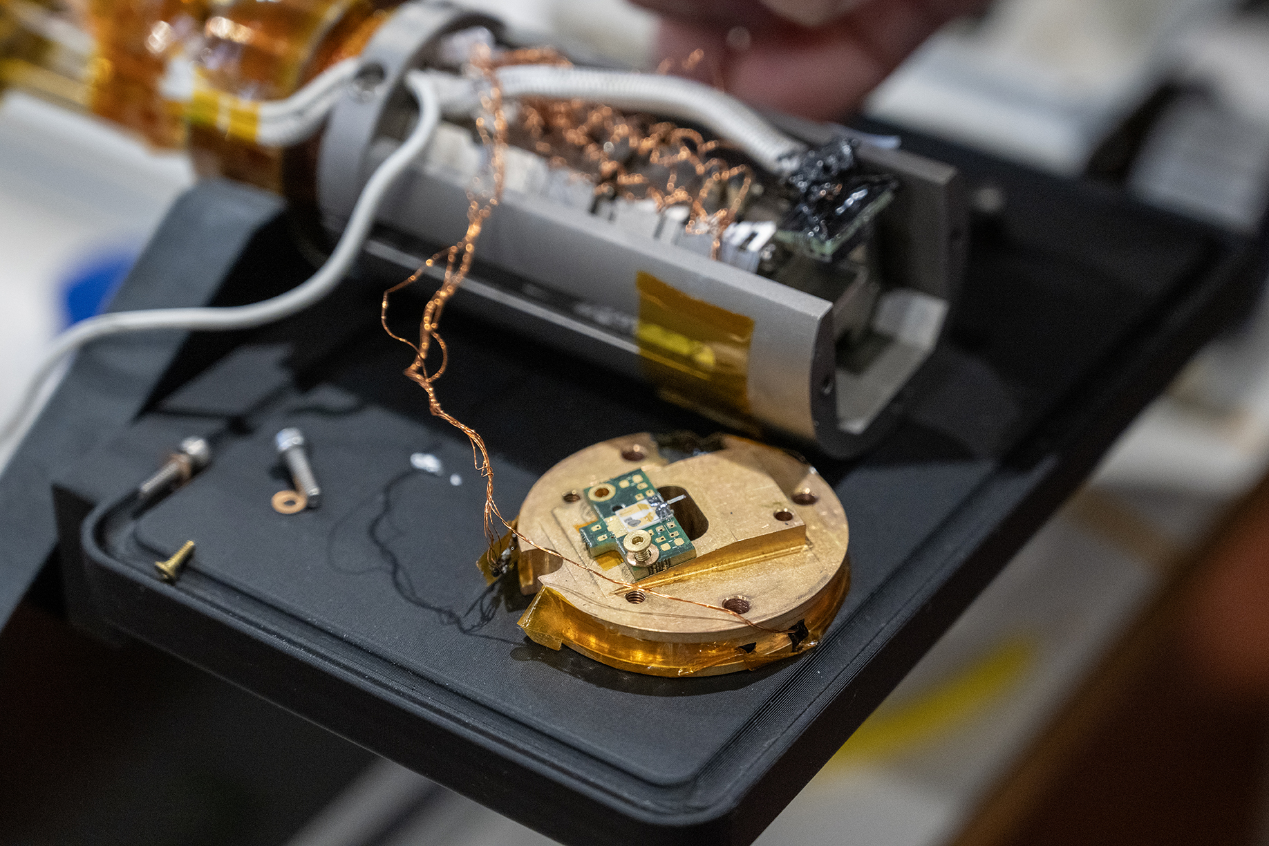 Since 2021, Rog and Lahabi have been working on the construction of this new microscope, affectionately nicknamed ‘Tortilla’ by the team. Its technical name is ‘Tapping Mode SQUID-on-Tip’ (TM-SOT). The build began with parts found in the attic of the university building, supplemented with a few commercial microscope components. It soon became clear, however, that their design requirements were so specific that they had no choice but to design and build almost every component themselves.