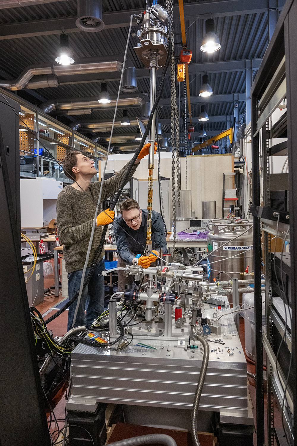 PhD candidates Matthijs Rog and Tycho Blom mounting the tip on the microscope -