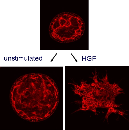 MDCK epithelial cells cultured in collagen gels for 7 days were then exposed to +/- HGF and cultured for a further 4 days. Cells were fixed and labeled with rhodamine phalloidin to label f-actin. HGF treatment induces branching morphogenesis (tubulogenesis).