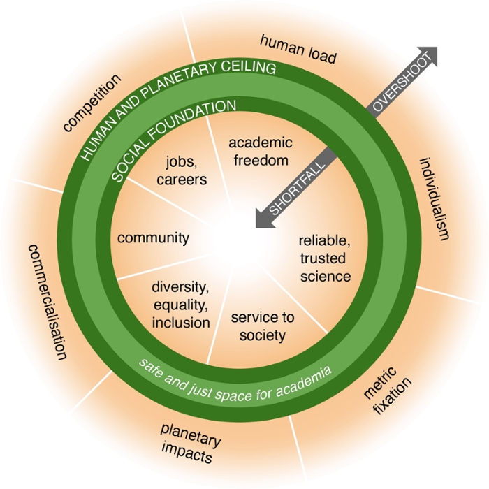 Addressing the climate crisis requires radical and urgent action at all levels of society. Universities are ideally positioned to lead such action but are largely failing to do so. At the same time, many academic scientists find their work impeded by bureaucracy, excessive competitiveness, and a loss of academic freedom. Here, drawing on the framework of “Doughnut Economics,” developed by Kate Raworth, we suggest seven new principles for rethinking the norms of scientific practice. Based on these, we propose a call to action, and encourage academics to take concrete steps towards the creation of a flourishing scientific enterprise that is fit for the challenges of the 21st century.