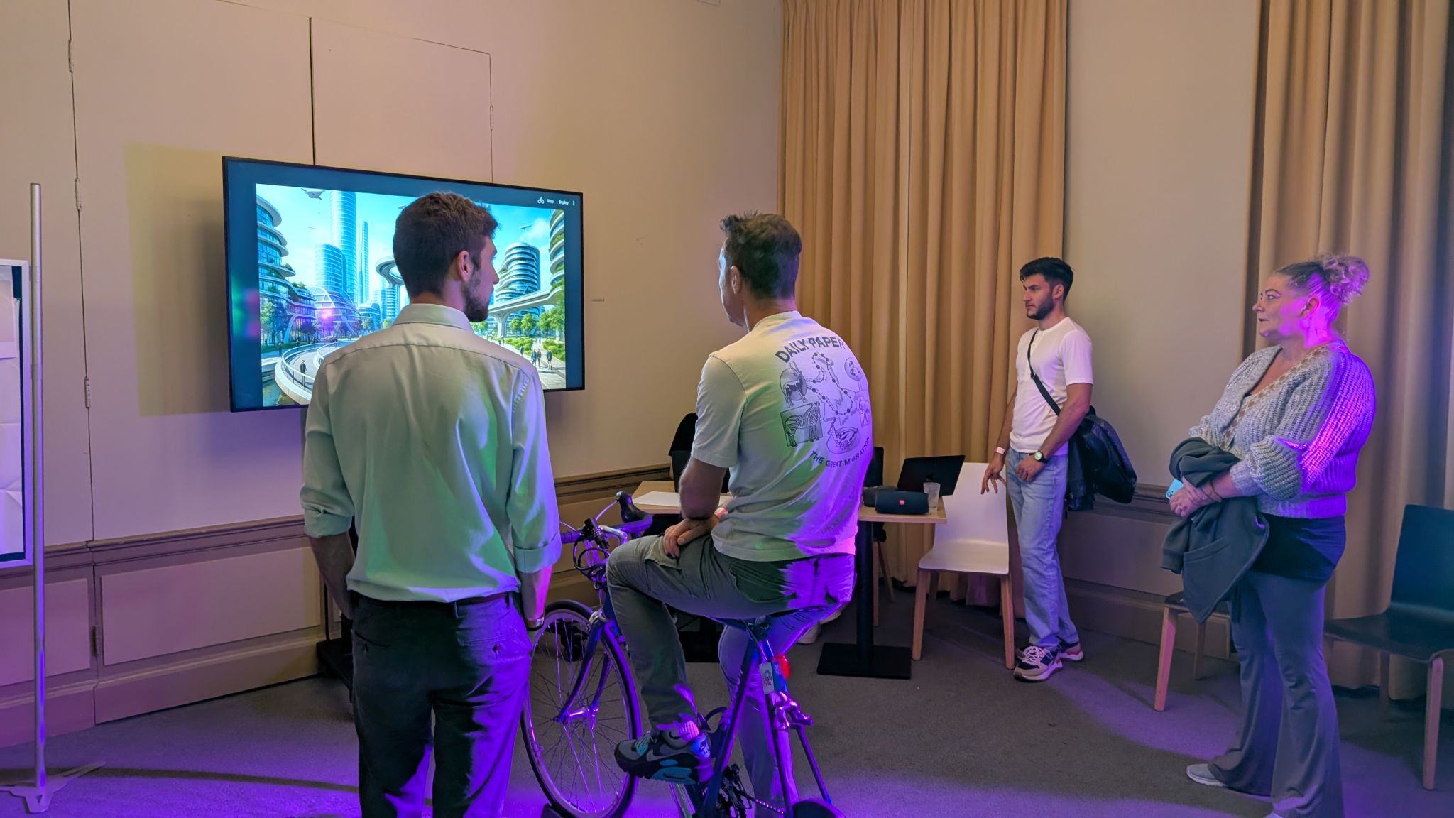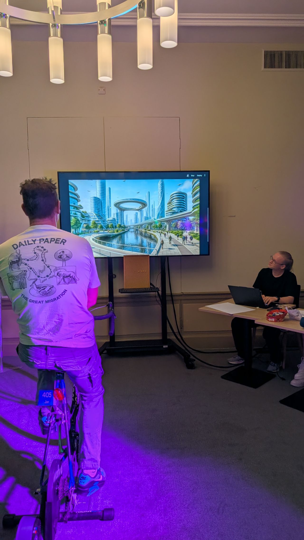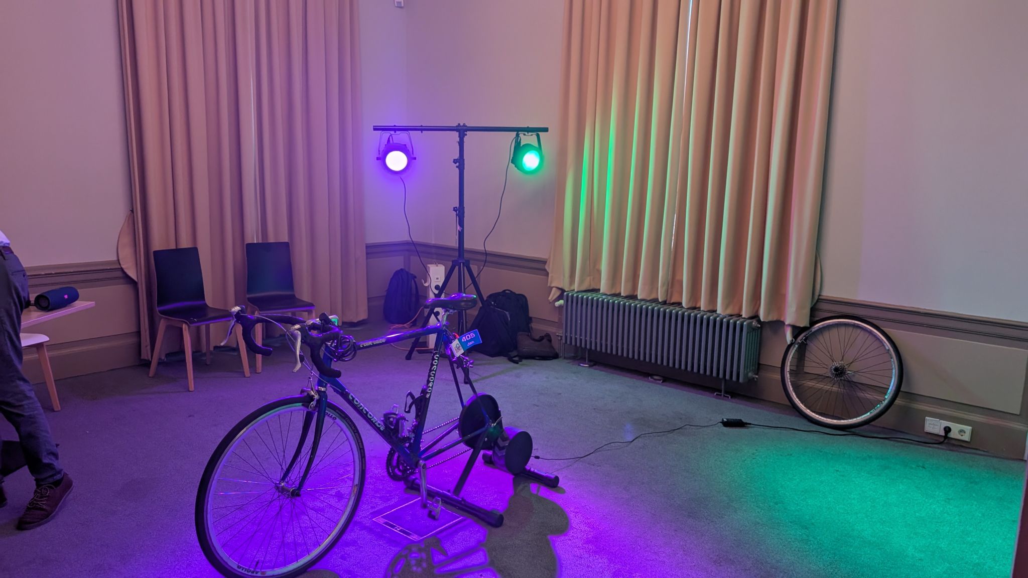 Our room was equipped with a race bike connected to a wattage meter that measured the wattage of each participant. On a large screen, participants could see the progress towards the wattage required for generating their image. Participants were asked to give a prompt of their choice, and in the background the query was made to a large language model. We worked with publicly available estimates of the required kWh for generating images of a specific resolution.