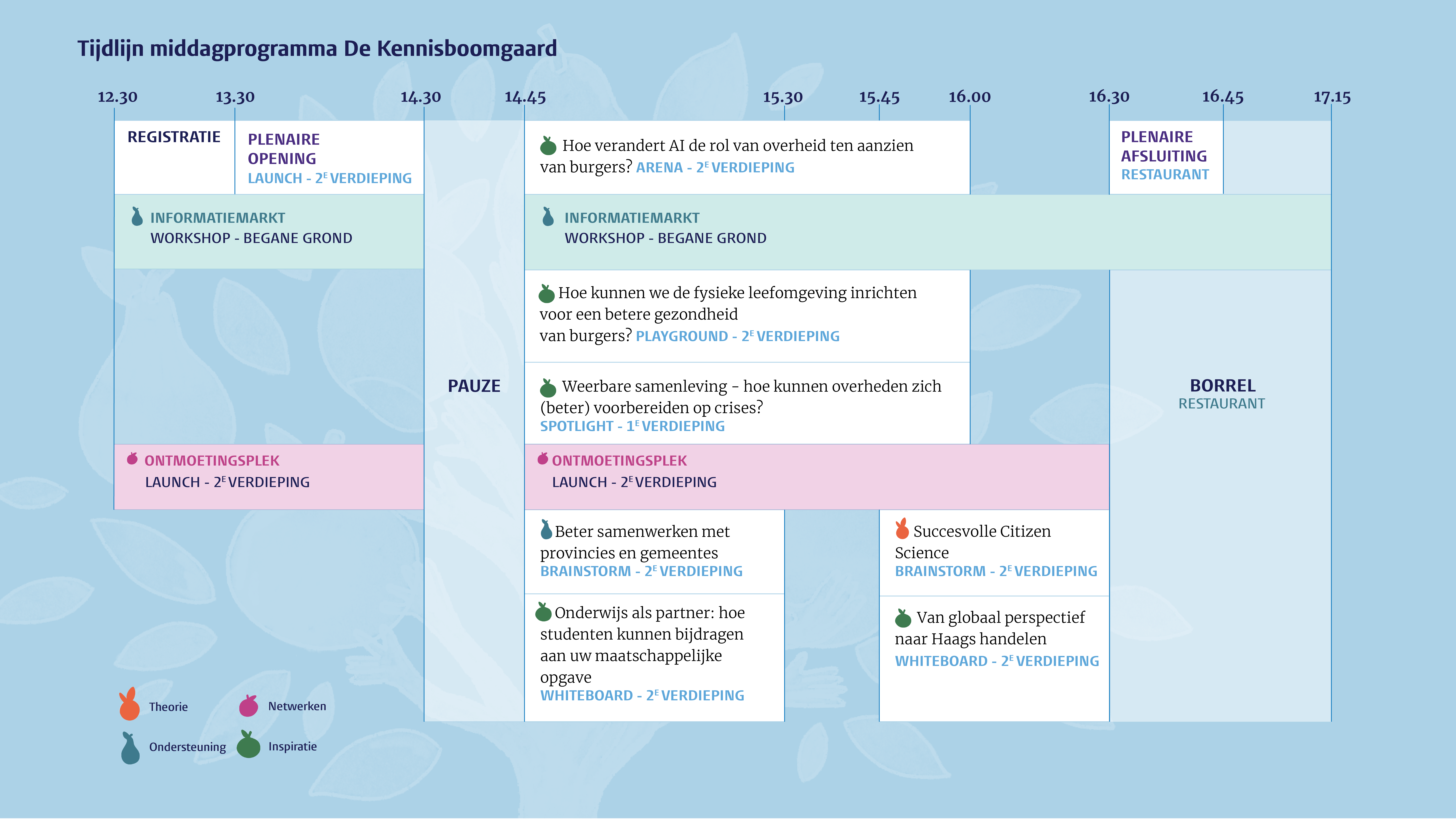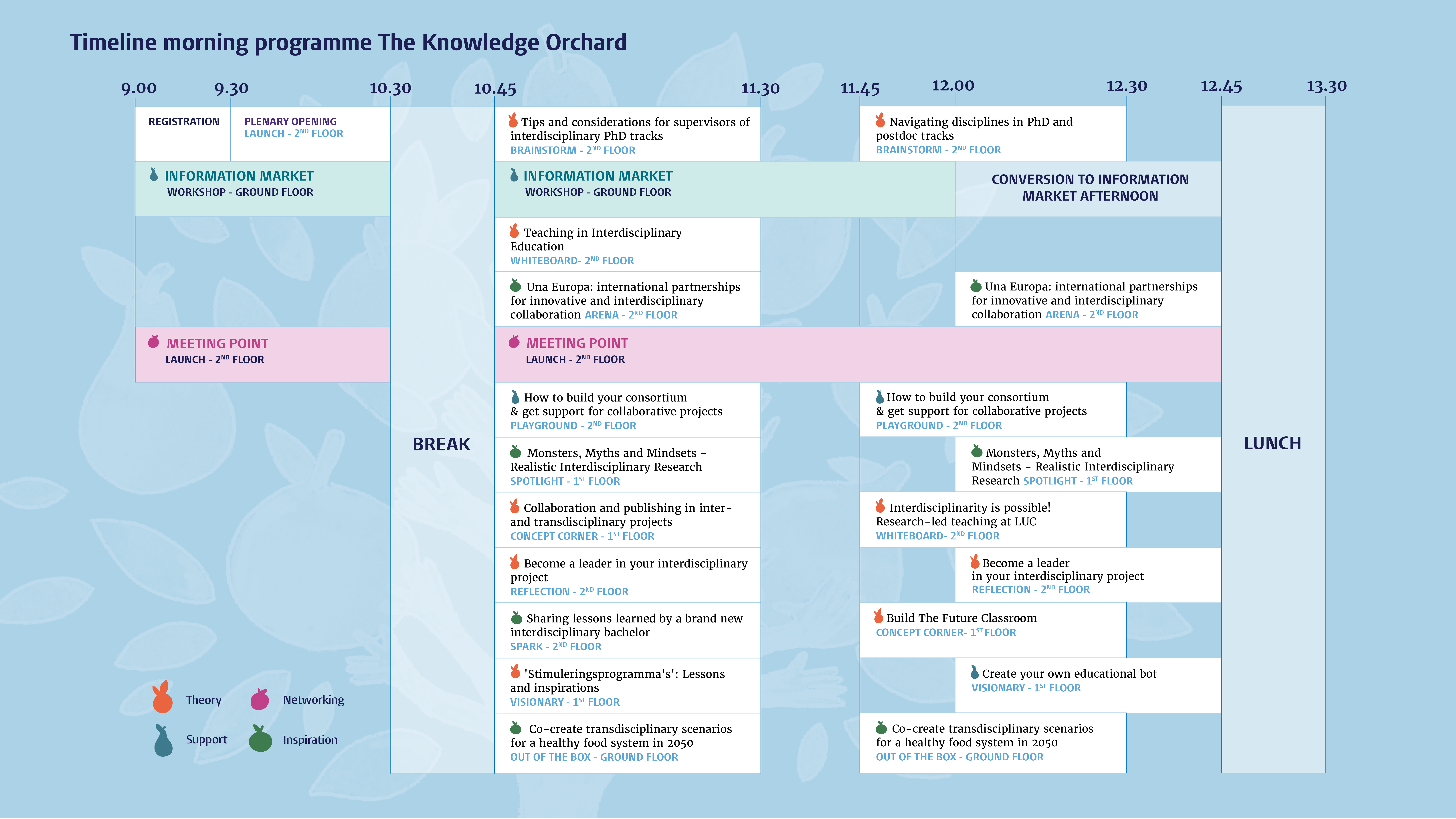 's Ochtends richt de Kennisboomgaard zich op het verstevigen van interdisciplinaire contacten en samenwerking binnen de Universiteit Leiden op gebied van onderzoek én onderwijs. De sessies zijn gericht op diverse soorten medewerkers: onderzoekers, docenten, bestuurders en ondersteunend personeel. Zie ook het blokkenschema rechts!