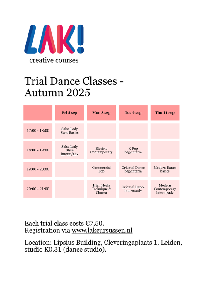 From 5 till 11 September the LAK offers diverse trial classes dance. Each trial class costs € 7,50. Check out the schedule and register now!
