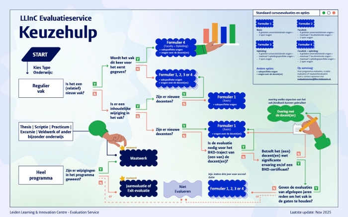 Voor evaluaties die afwijken van bovenstaande cursusevaluaties, zoals programma-evaluaties, thesis-evaluaties of evaluaties op maat, kun je contact opnemen via evaluatieservice@llinc.leidenuniv.nl.