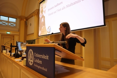 ‘Ik ga kijken of ik het komende halfuur schrijvers van jullie kan maken’, begint Treur haar speech nadat de leerlingen die nét naast een finaleplaats grepen in de banken van het prachtige auditorium van het Kamerlingh Onnesgebouw hebben plaatsgenomen. Dat die leerlingen goed kunnen spreken werd eerder vandaag al duidelijk; Treur ziet meteen al nog meer ambities in deze toekomstige generatie studenten. Dat is wat de rode draad zou worden in haar verhaal: wat gaan de leerlingen van nu, de studenten van morgen, betekenen voor de wereld? Of dat nu is via het gesproken of het geschreven woord.