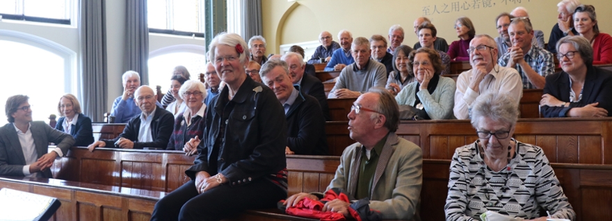 Na dit eerbetoon nam biologe Rinny Kooi, botanisch curator van het Singelpark, het stokje over. Ze leidde de aanwezigen vanuit hun collegebanken alvast kort door het Singelpark in 100 slides. Daarbij stond ze stil bij de bijzondere bomen langs de Singeloevers, zoals de beuk van begraafplaats Groenesteeg. Die is zo knoestig doordat hij een combinatie is van een groene en een bruine beuk, legde Kooi uit. Vervolgens wandelden de NGL-leden door de volop in bloei staande Hortus naar de rondvaartboot aan de aanlegsteiger.