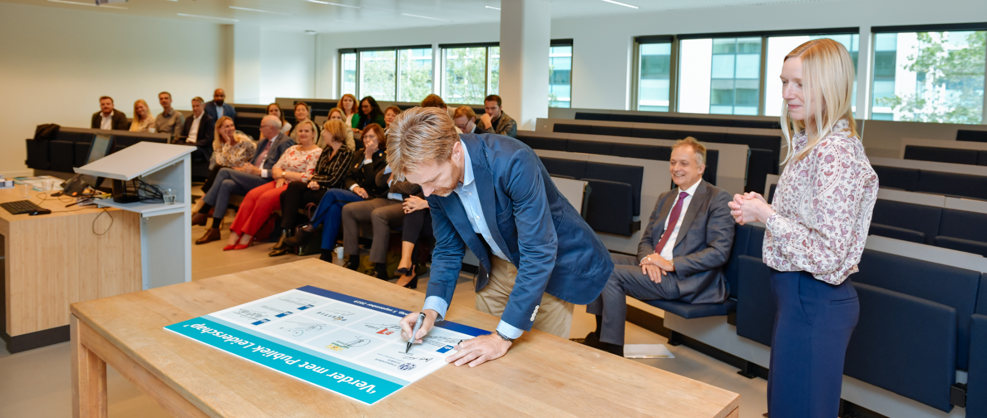 Ben Kuipers ondertekent, onder toeziend oog van Sandra Groeneveld, het partnerschap 'Verder met Publiek Leiderschap' -