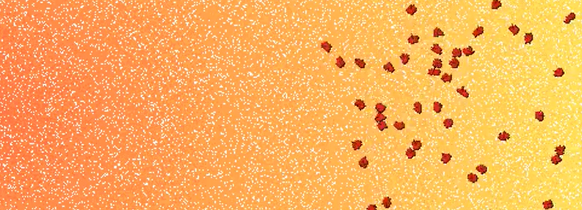 Headerafbeelding: eencelligen (rechts) kunnen de voortplantingsplek niet vinden (aangegeven als donkere gradient aan de linkerzijde). Door Colizzi et al.