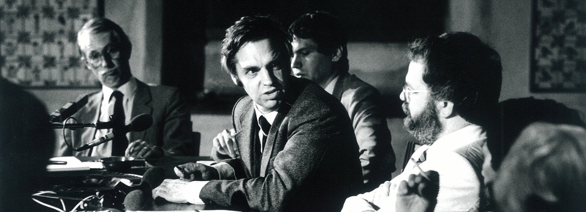 Headerfoto door Wim Riemens: ‘Forum Discussie’; Andreas Oosthoek, Leendert Couprie, Karel Geirlandt, Hein van Haren, Jan Hoet, Eric Schutijzer and Marinus Boezem. 14.09.1984