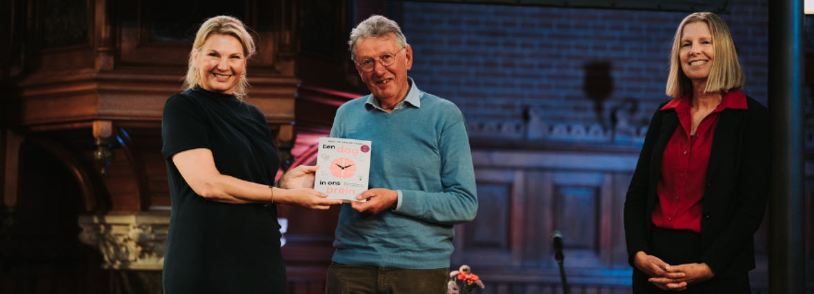 Eveline Crone werkt als hoogleraar Ontwikkelingsneurowetenschap in de Maatschappij aan de Erasmus Universiteit een Rotterdam, waar ze het Synclab leidt. Deels heeft ze een aanstelling in Leiden. Vorige week werkte ze 25 jaar aan de universiteit. Maurits van der Molen begeleidde een kwart eeuw geleden Crone’s promotietraject aan de UvA en reikt haar het boek uit. ‘Bij Eveline gaat het altijd om de inhoud. Als promovendus wilde ze resultaten uit het lab al naar buiten brengen, en nu doet ze dat nog steeds. Haar werk stelt ouders gerust, gedrag heeft soms met het onvolwassen brein te maken. Het helpt hun kinderen beter begrijpen. Door Eveline zijn ouders en leerkrachten hongerig geworden naar het brein.’