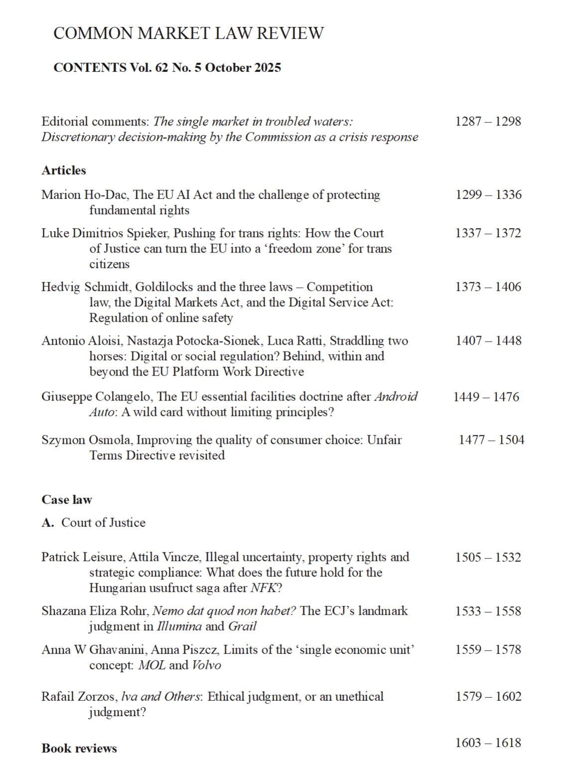 Het oktober 2025 nummer van de Common Market Law Review, Vol. 62 No. 5, is nu online beschikbaar.
